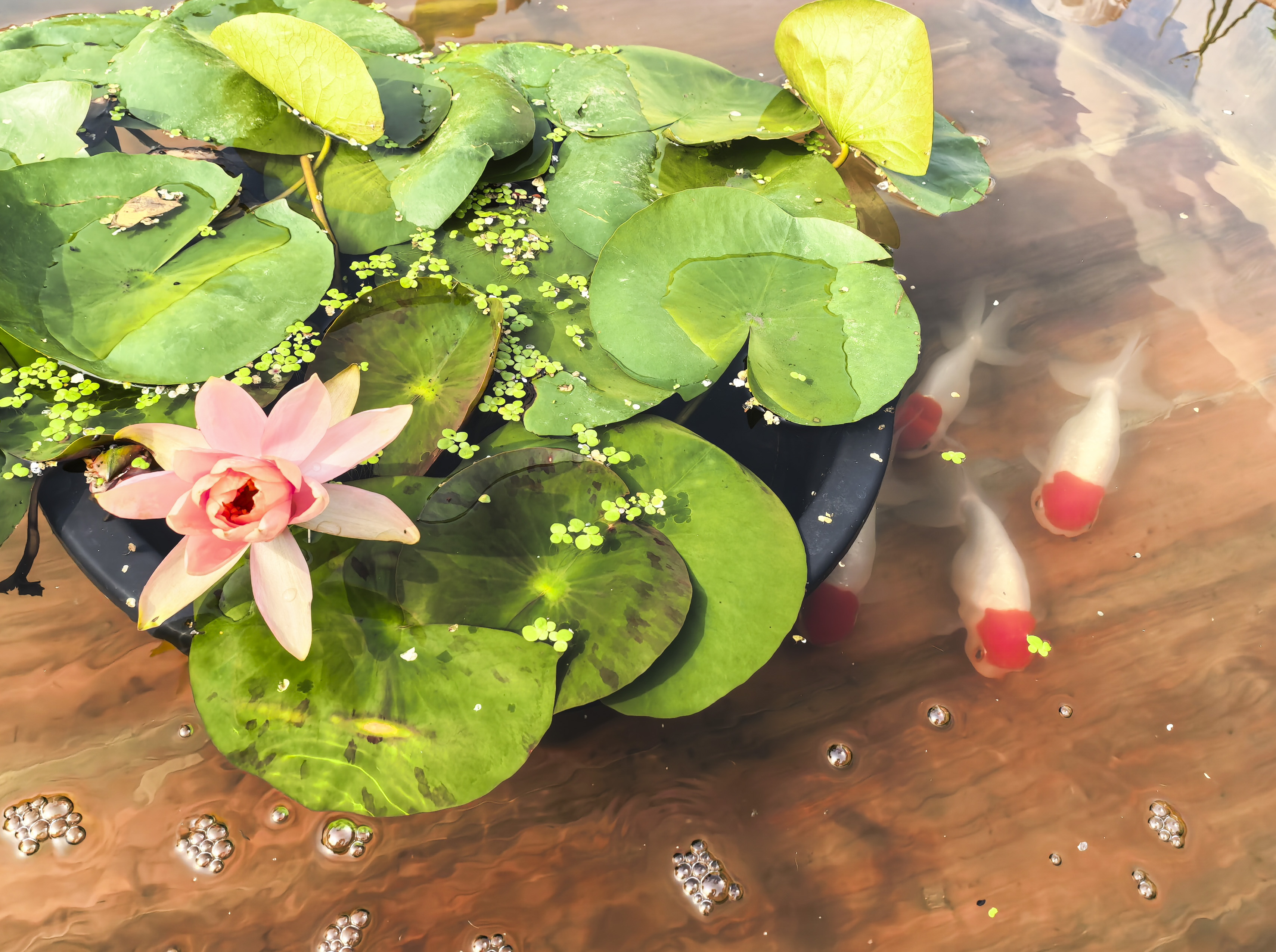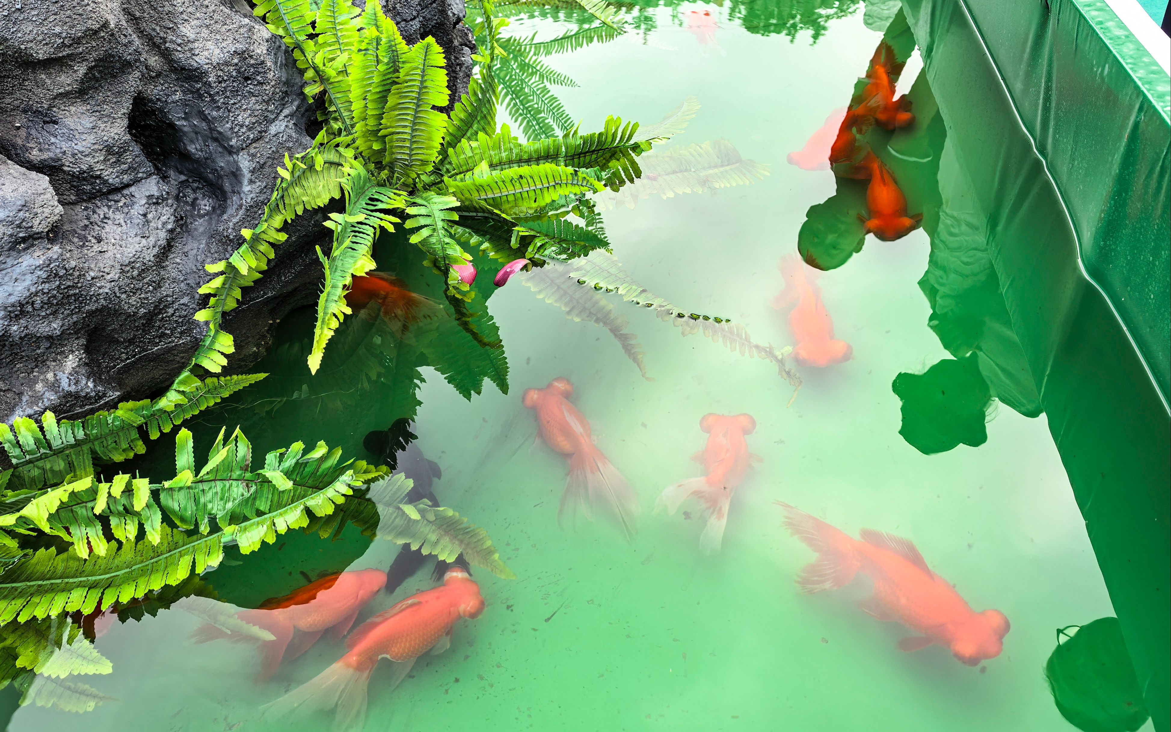 鹅头红金鱼在木海内游弋。新京报记者 浦峰 摄