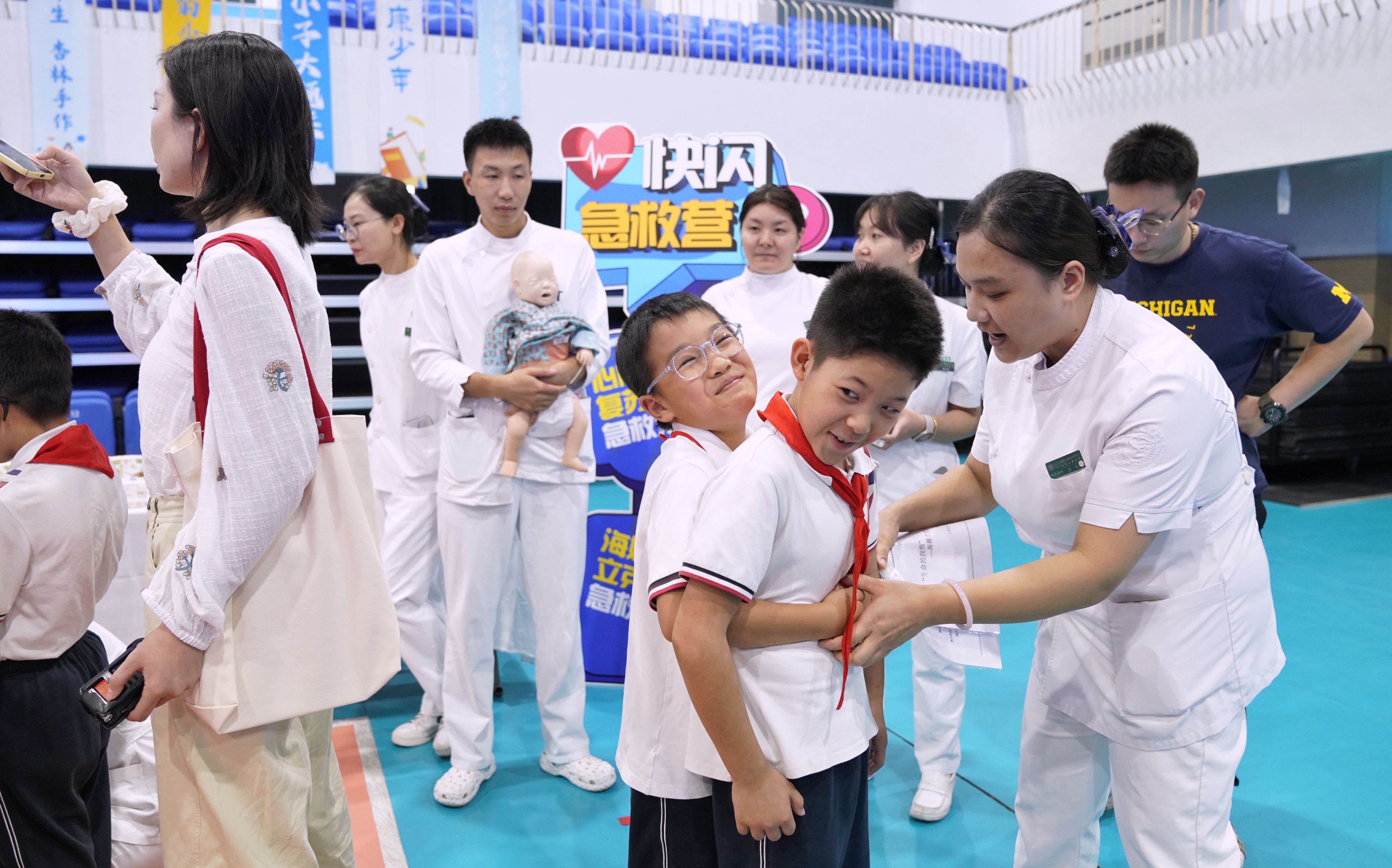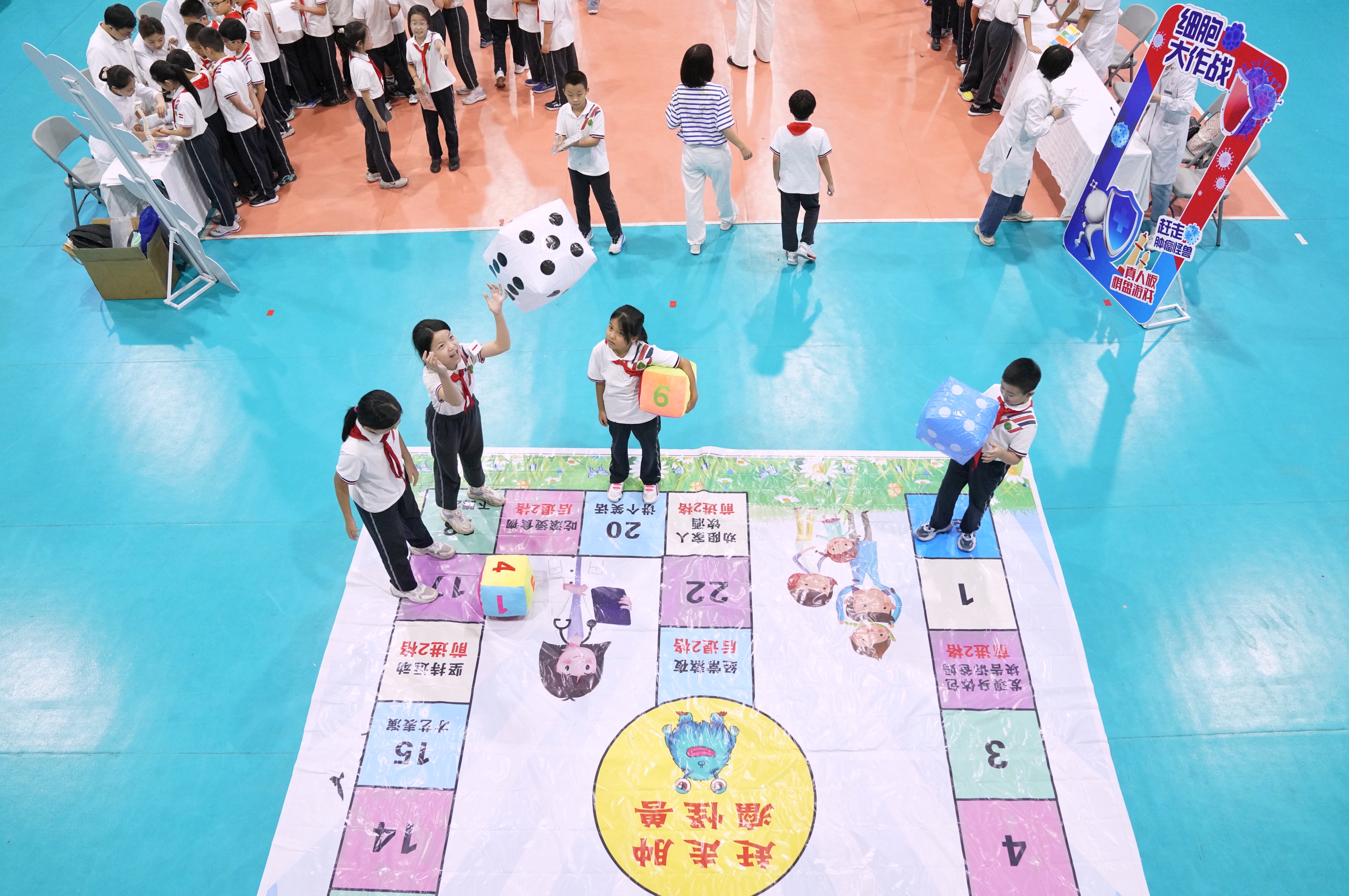 活动现场分设“舌尖上的营养秘籍”“做情绪的小主人”“守护骨骼小卫士”“眼球小子大通关”“口腔探险队”“国潮养生 杏林手作”“细胞大作战”“快闪急救营”8个主题区域,共有21个互动体验游戏。活动现场既有从诊室走进校园的菌斑检测仪、心率仪、屈光镜片、沙盘等,也有专为孩子们设计的心理健康AI机器人互动、赶走肿瘤怪兽真人版棋盘游戏、中药香囊制作、“健康早餐我做主”DIY等,还有心肺复苏急救法、海姆立克急救法,以及骨折、磕碰伤处理等硬核急救实操体验。孩子们在游戏中掌握相关生命健康知识。