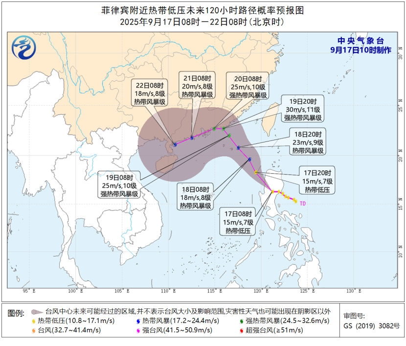 在菲律宾东侧近海的热带扰动已发展为热带低压,将于今天夜间至明天加强为今年第17号台风“米娜”,预计之后将趋向广东一带沿海。