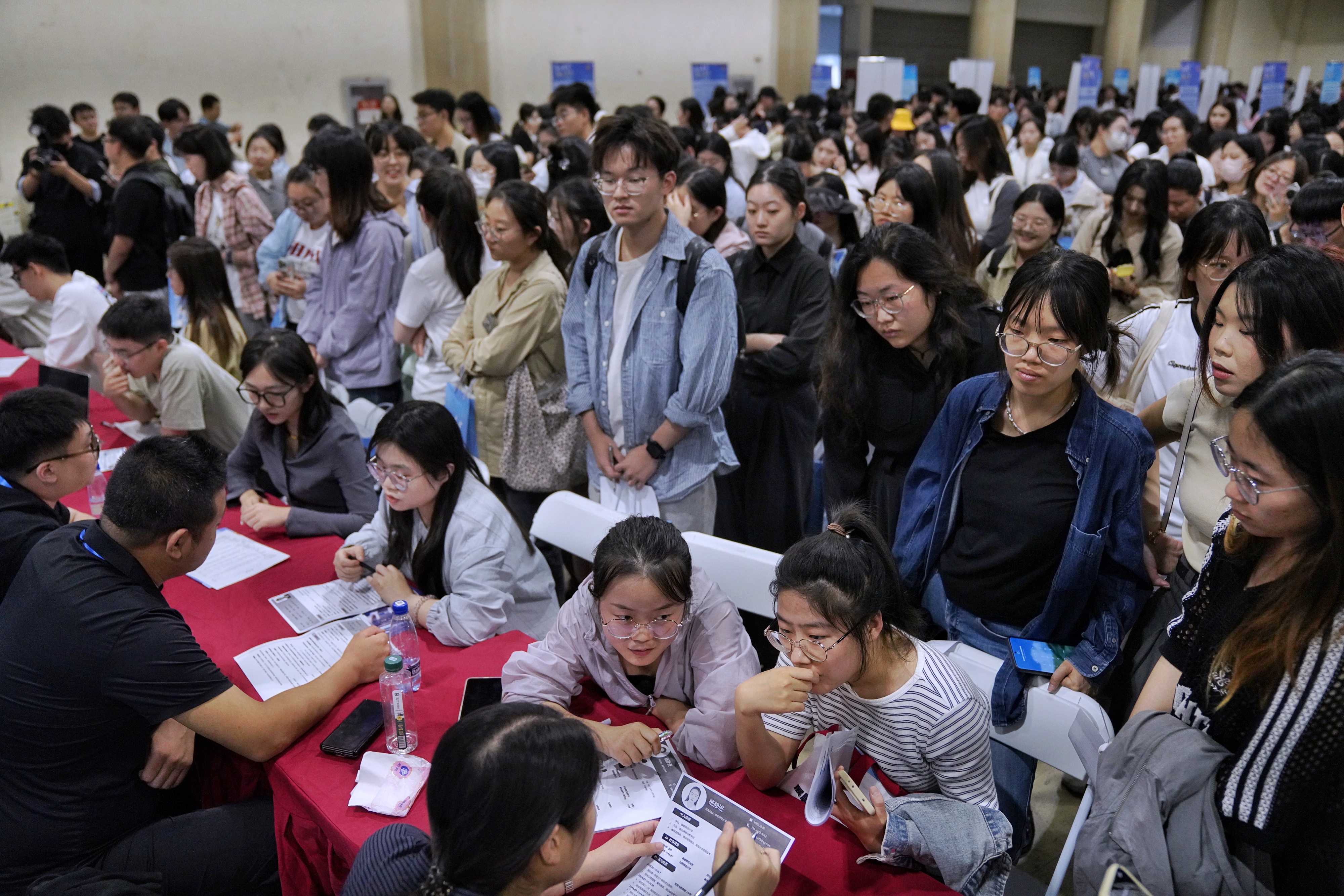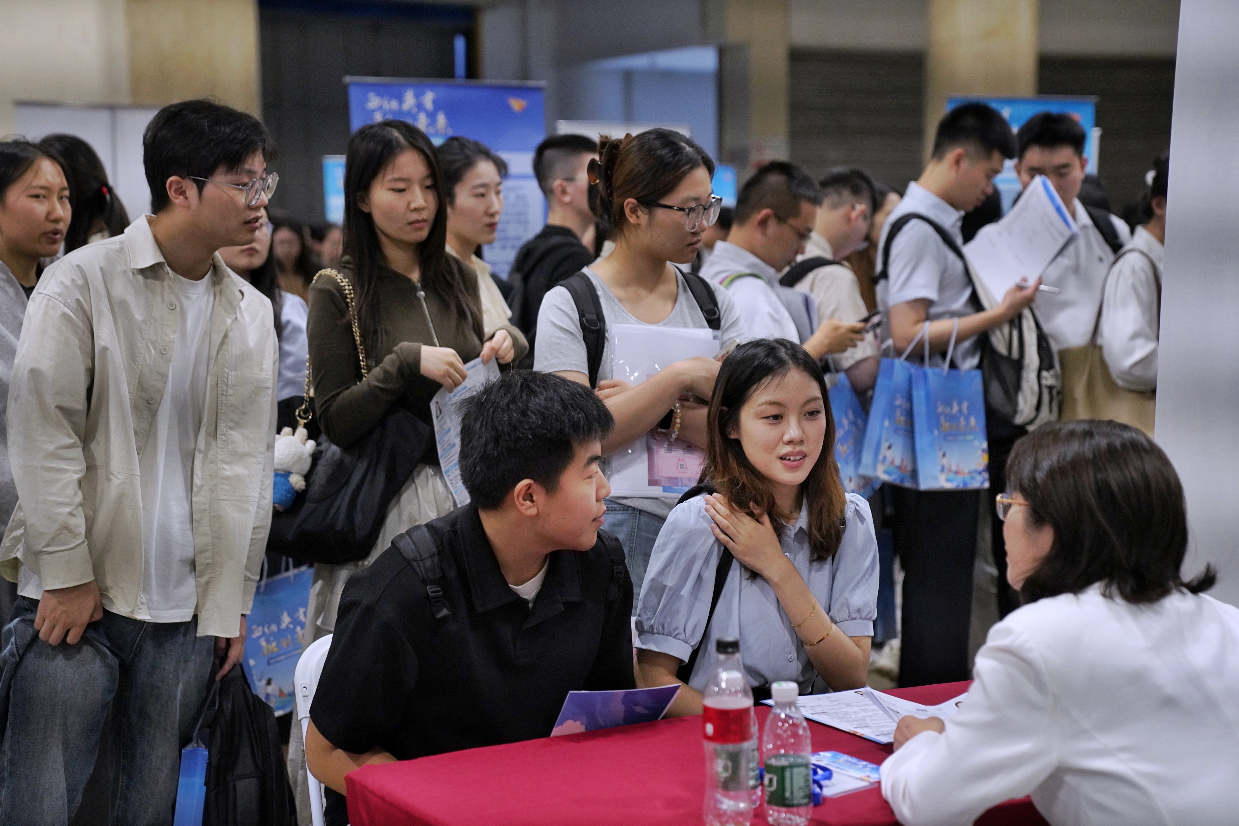 9月17日,北京展览馆,西城区“西纳英才 融创未来”2026年高校人才招录招聘系列活动上,求职的学生们在展位咨询求职信息。新京报记者 薛珺 摄