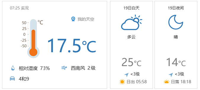 今天白天阴(山区局地小阵雨)转晴,北转南风二三间四级,最高气温25℃;夜间晴,南转北风一二级,最低气温14℃。