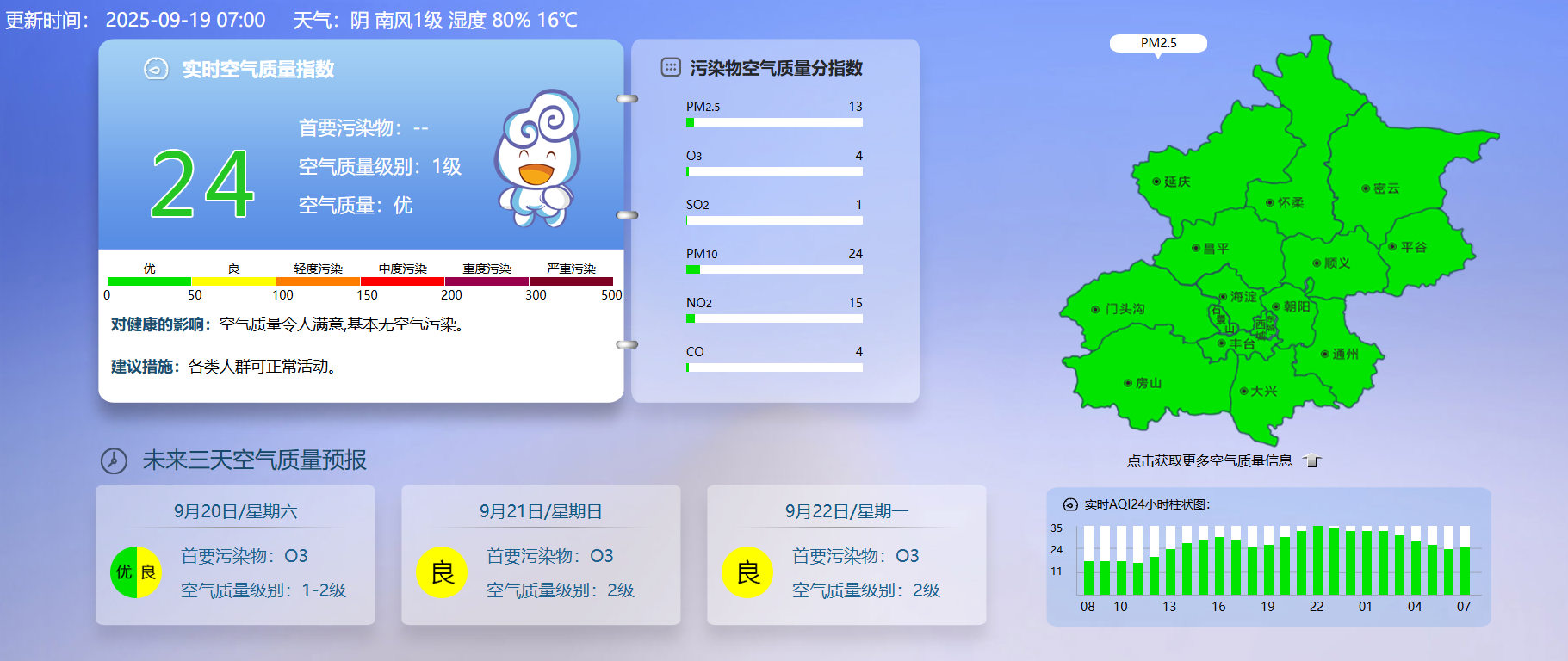 据北京市生态环境监测中心今早7时数据,目前实时空气质量指数24,空气质量优。