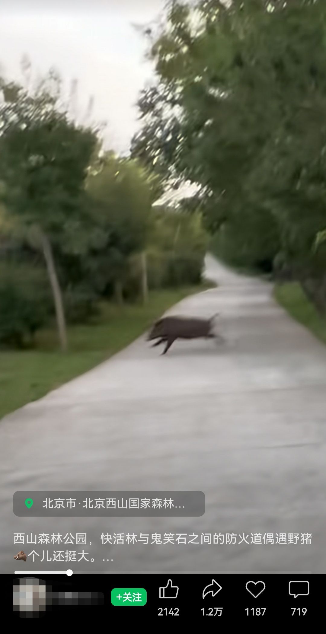 新京报讯(记者张璐)近日,有网友发布视频称,在北京西山国家森林公园快活林与鬼笑石之间的防火道上偶遇野猪,个儿还挺大。对此,世界动物保护协会科学家孙全辉建议,公园管理部门应加强监测和预警,及时发布相关信息,在野猪经常出没的地方增设警示牌和安全提示信息。