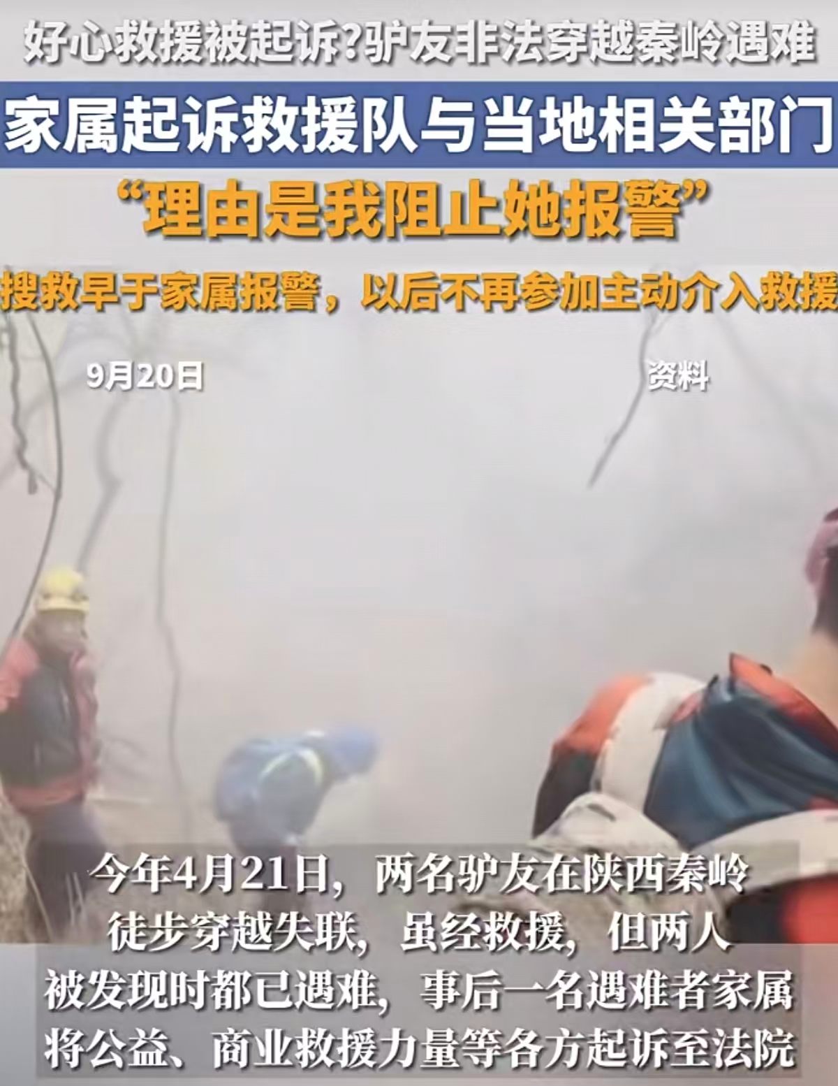 9月19日,红星新闻刊发了《秦岭4·21失联事件遇难者家属起诉救援队等各方 一公益救援者:好心救援却被告》。此事起源于今年4月21日,两名驴友在陕西秦岭“光鹿跑兵冰”路线徒步穿越失联,虽经救援,但两人被发现时都已遇难,事后一名遇难者家属将公益、商业救援力量,以及相约爬山的同行人员、事发地生态环境保护管理部门起诉至法院,案件在9月17日公开审理。