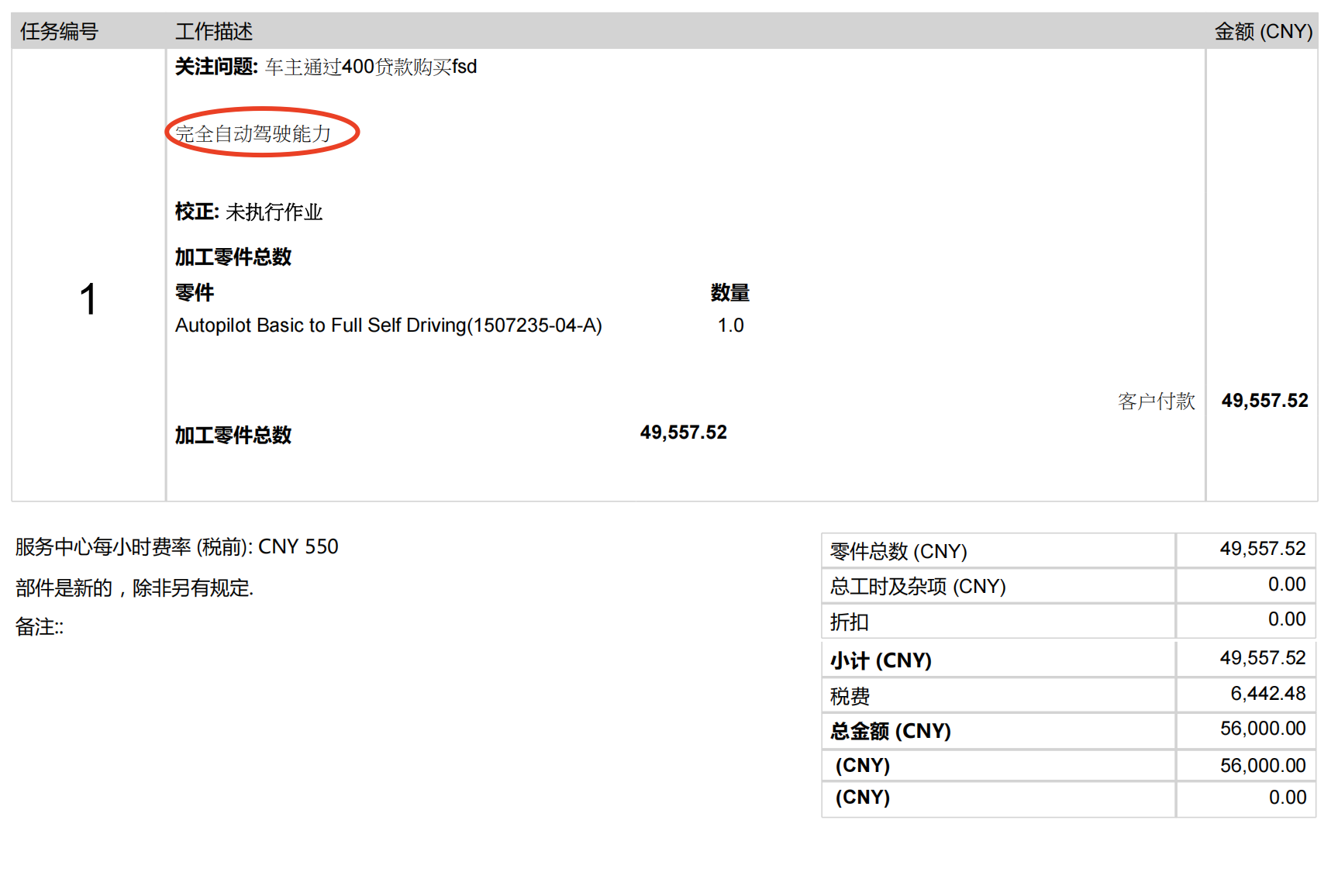 路飞购买特斯拉FSD功能的结算单。受访者供图