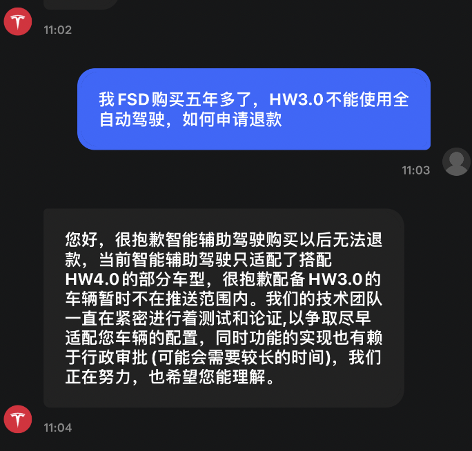路飞曾在特斯拉App向人工客服申请退款,根据他提供的对话截图,客服回复称:“智能辅助驾驶购买以后无法退款。”