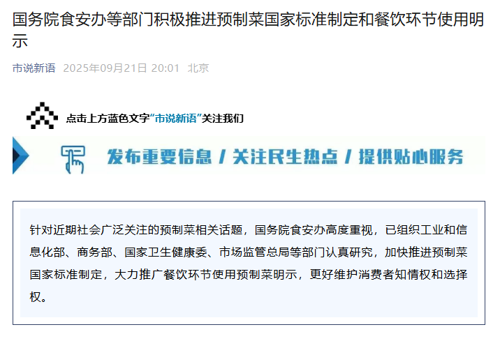 国务院食安办等部门积极推进预制菜国家标准制定和餐饮环节使用明示