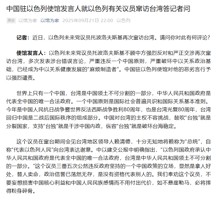 使馆发言人:以色列未来党议员托波洛夫斯基不顾中方强烈反对和严正交涉再次窜访台湾,多次发表涉台错误言论,严重违反一个中国原则,严重破坏中以关系政治基础,已经成为中以关系健康发展的“麻烦制造者”。中国驻以色列使馆对他的恶劣言行予以强烈谴责。
