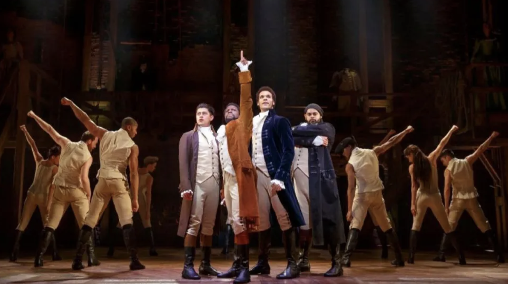 以美国建国元勋为蓝本,演员全部为少数族裔出演的歌剧《汉密尔顿》剧照。