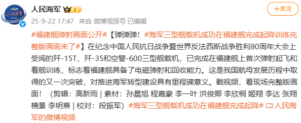 新京报讯 据人民海军官博消息,在纪念中国人民抗日战争暨世界反法西斯战争胜利80周年大会上受阅的歼-15T、歼-35和空警-600三型舰载机,已完成在福建舰上首次弹射起飞和着舰训练,标志着福建舰具备了电磁弹射和回收能力。这是我国航母发展历程中取得的又一次突破,对推进海军转型建设具有里程碑意义。
