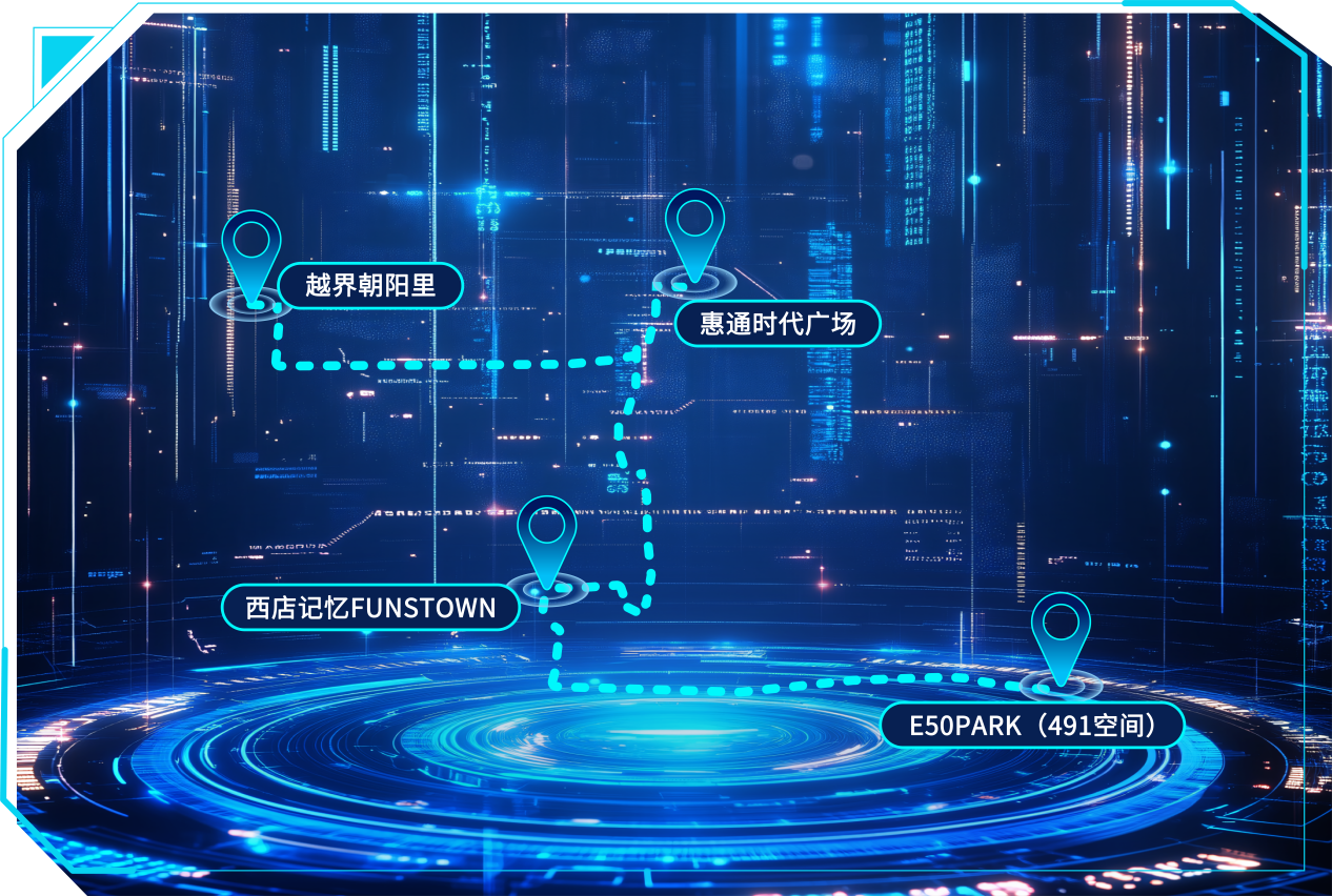 线路点位:越界朝阳里→惠通时代广场→西店记忆FUNSTOWN→E50PARK(491空间)