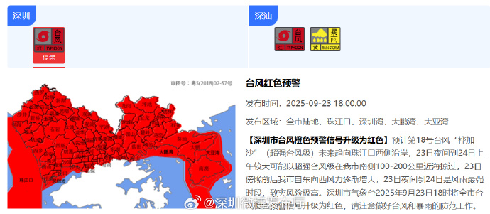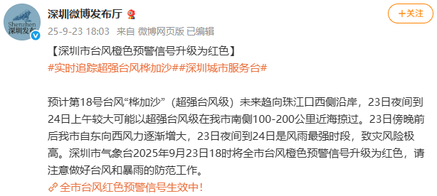 新京报讯 据深圳微博发布厅消息,预计第18号台风“桦加沙”(超强台风级)未来趋向珠江口西侧沿岸,23日夜间到24日上午较大可能以超强台风级在深圳市南侧100-200公里近海掠过。23日傍晚前后深圳市自东向西风力逐渐增大,23日夜间到24日是风雨最强时段,致灾风险极高。深圳市气象台2025年9月23日18时将全市台风橙色预警信号升级为红色,请注意做好台风和暴雨的防范工作。