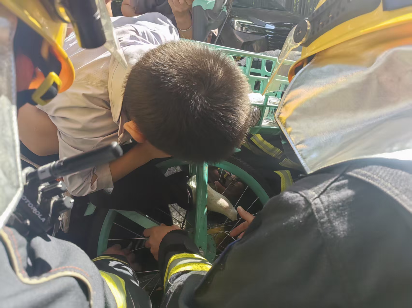 儿童脚卡自行车前轮哭闹不止,消防员暖心救援
