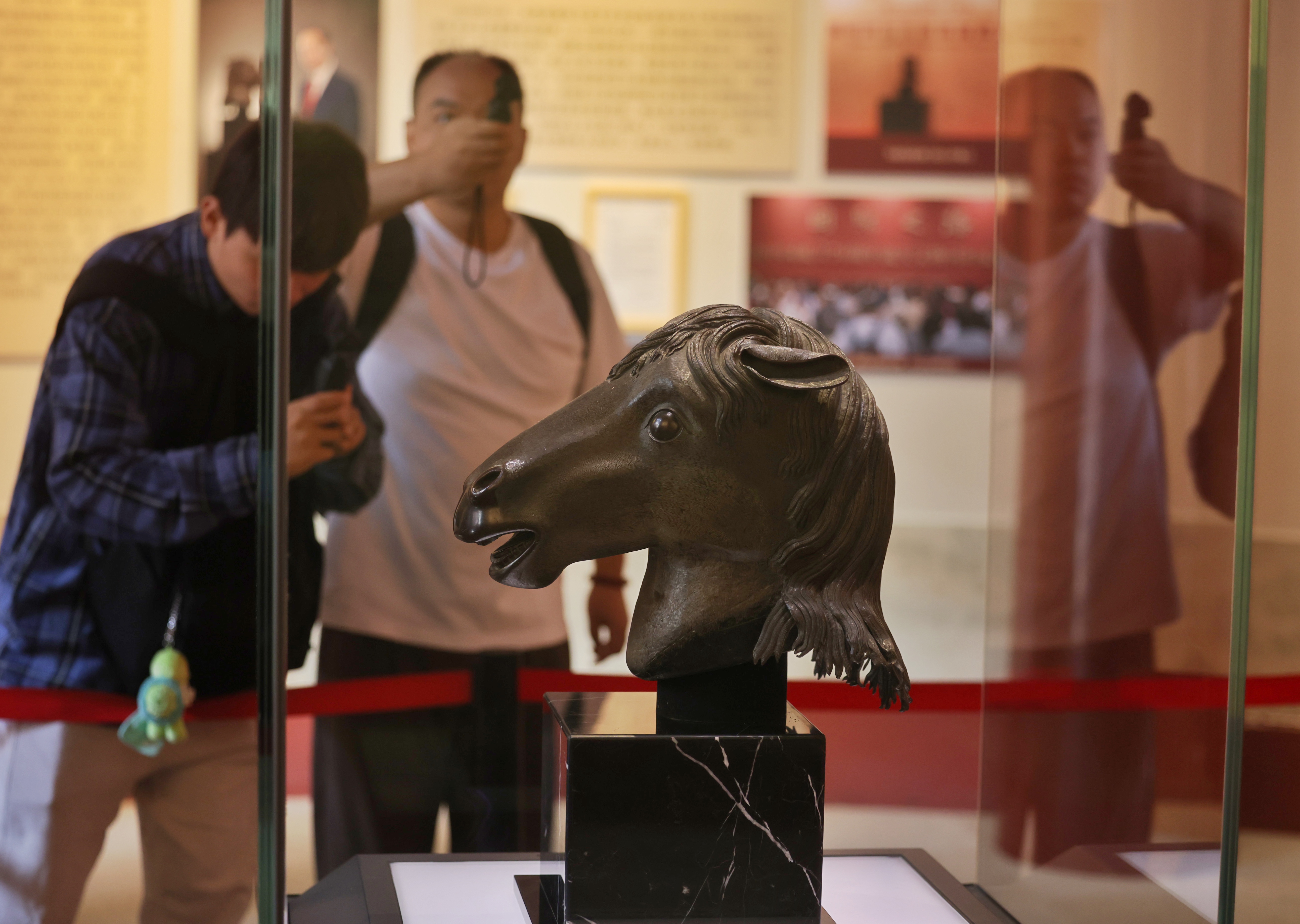 博物馆中路展厅为“百年梦圆——圆明园马首铜像回归展”,本展通过圆明重光、万园之园、圆梦之基三部分系统讲述、阐释圆明园历史和文化内涵,着重描述马首铜像回归历程及制造工艺。“我们可以看到,马首左右两边耳朵不一样,左边的耳朵在被劫掠的过程中受损。”圆明园博物馆馆员王梓辰介绍。
