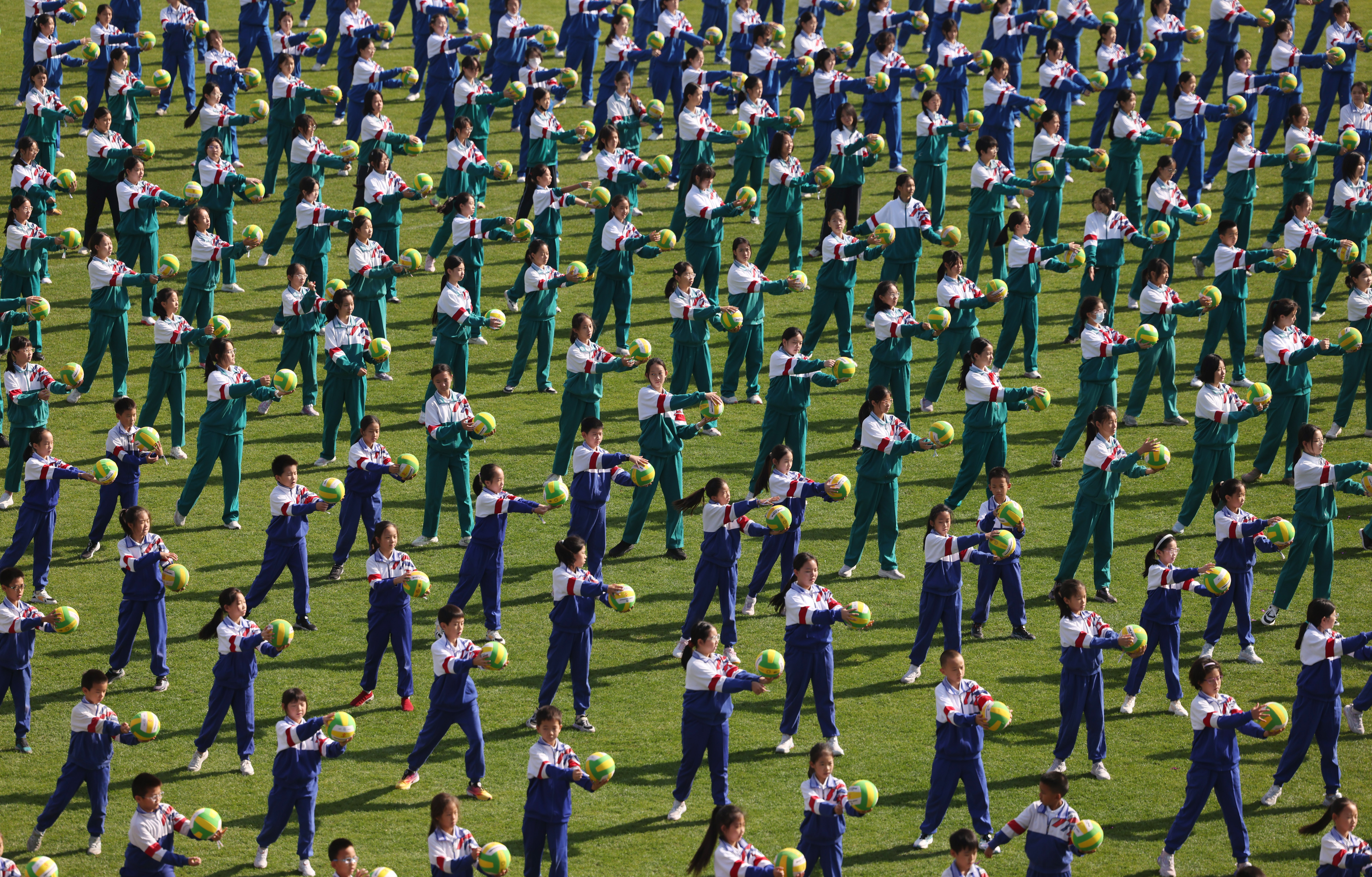 千人排球操展示中,不同年级的学生手持排球,画面十分壮观。新京报记者 李木易 摄