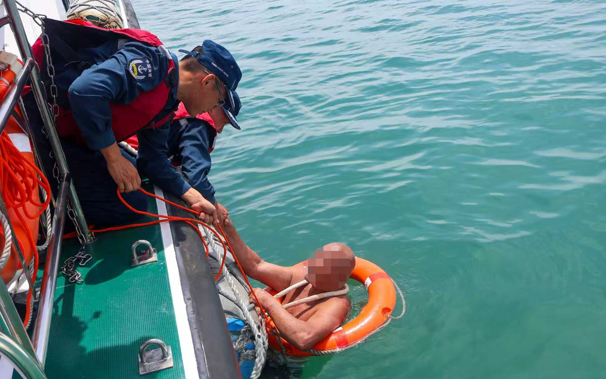 海警执法人员合力将老人拉上摩托艇。受访者供图