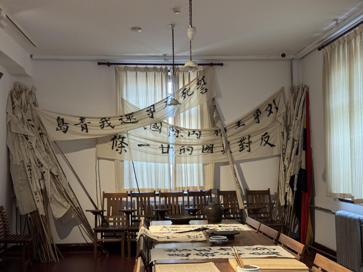 五四游行筹备室中,“外争主权内除国贼”等旗帜、标语陈列其间。 新京报记者徐彦琳 摄