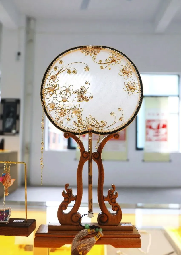 精美珍珠装饰团扇,尽显工艺与珍珠之美。