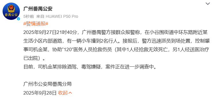 2025年9月27日21时40分,广州番禺警方接群众报警称,在小谷围街道中环东路附近某生活小区内部道路,有一辆小车撞到2名行人。接报后,警方迅速派员到场处置,控制肇事司机金某,协助“120”医务人员抢救伤员(其中1人经抢救无效死亡,另1人经送医治疗已出院)。