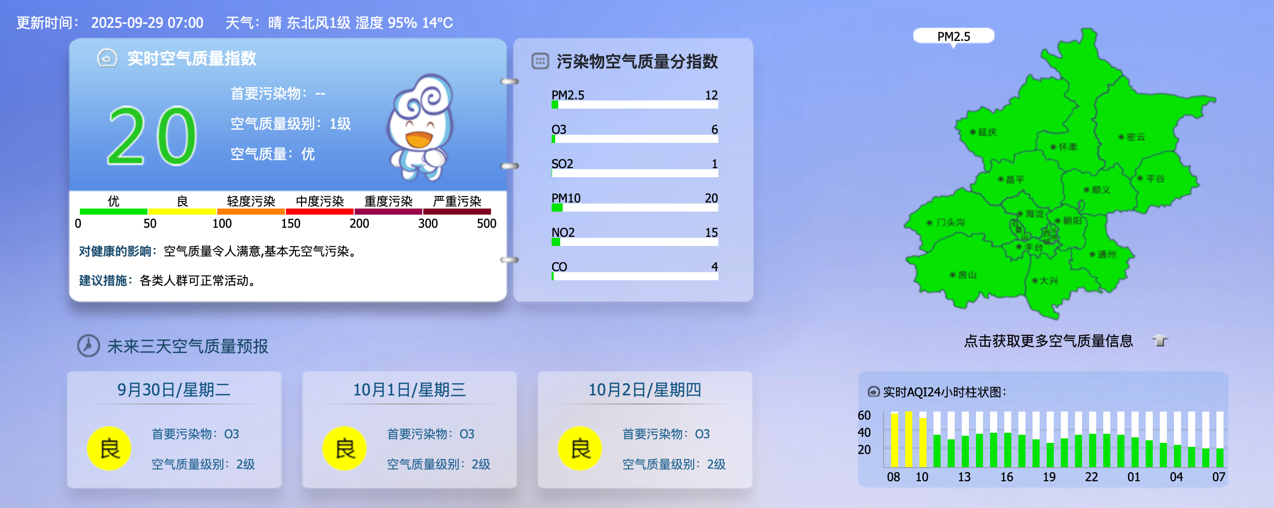 据北京市生态环境监测中心今早7时数据,目前实时空气质量指数20,空气质量优。