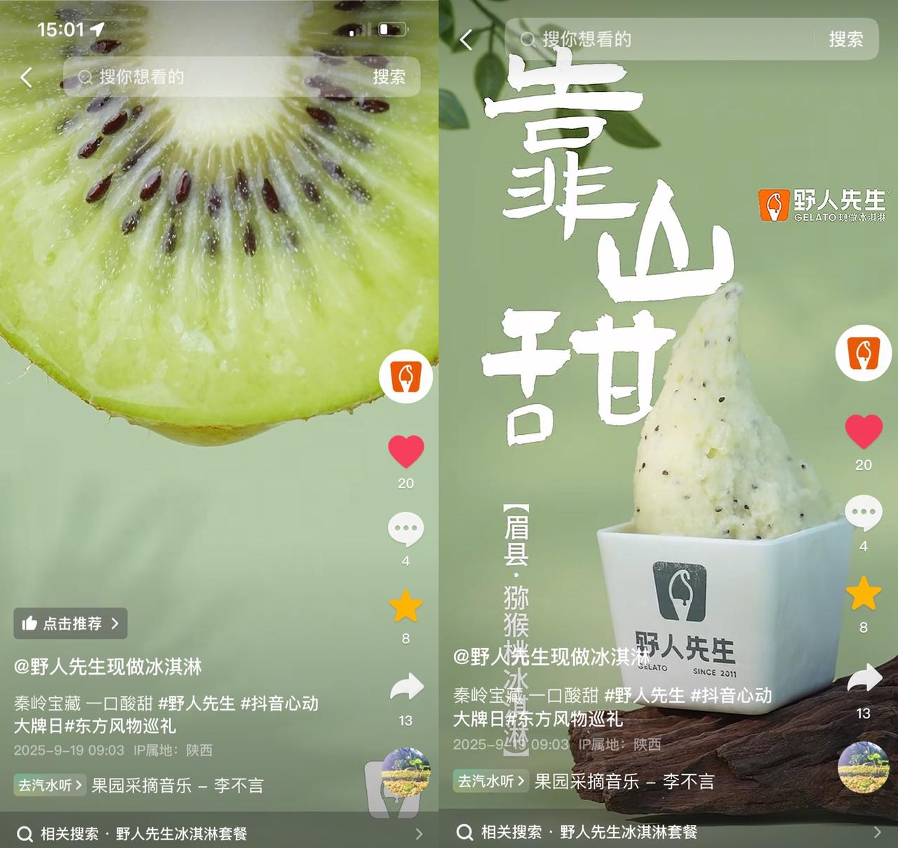 今年9月15日,野人先生上线新品眉县猕猴桃冰淇淋,应季上新,仅供60天。作为原材料的眉县猕猴桃取自秦岭,是中国国家地理产品。在成熟季到来之前,野人先生已经有一个几十人的团队驻守在产地,用镜头记录下一颗颗猕猴桃在深山中汲取阳光和养料生长,被采摘后通过冷链运输到各个门店,最终变成店员手中递给顾客的冰淇淋的过程。