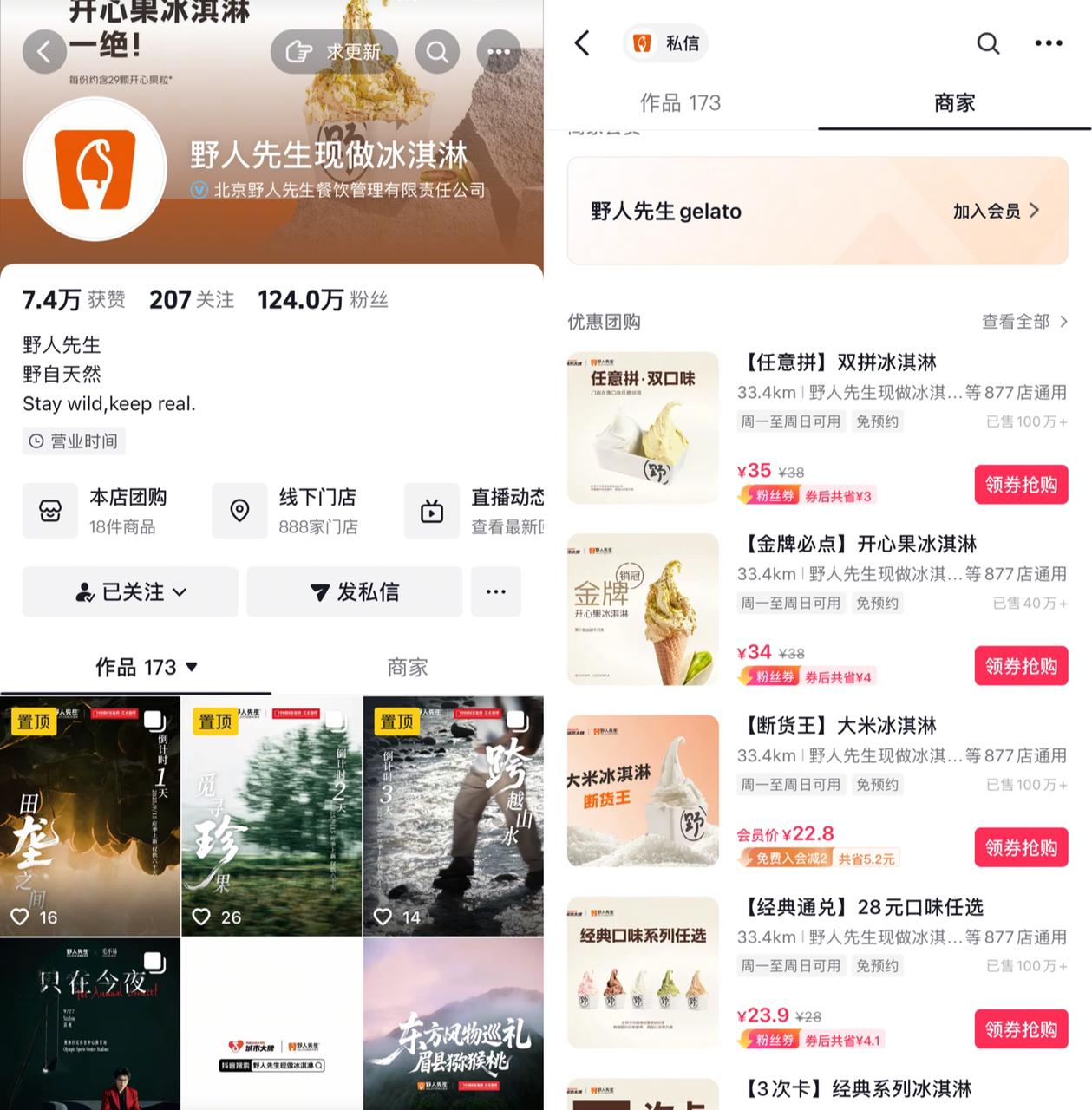 在把冰淇淋递给顾客的那一刻,也是在传递美好。前期品牌稳扎稳打,逐步开出百余家店。这两年,野人先生已经在全国各地开出900多家店面,其中888家门店入驻抖音,在抖音实现了统一上新和统一卖券等管理模式。
