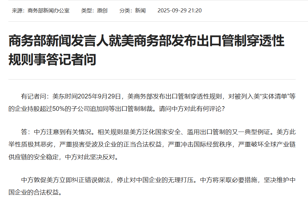 有记者问:美东时间2025年9月29日,美商务部发布出口管制穿透性规则,对被列入美“实体清单”等的企业持股超过50%的子公司追加同等出口管制制裁。请问中方对此有何评论?