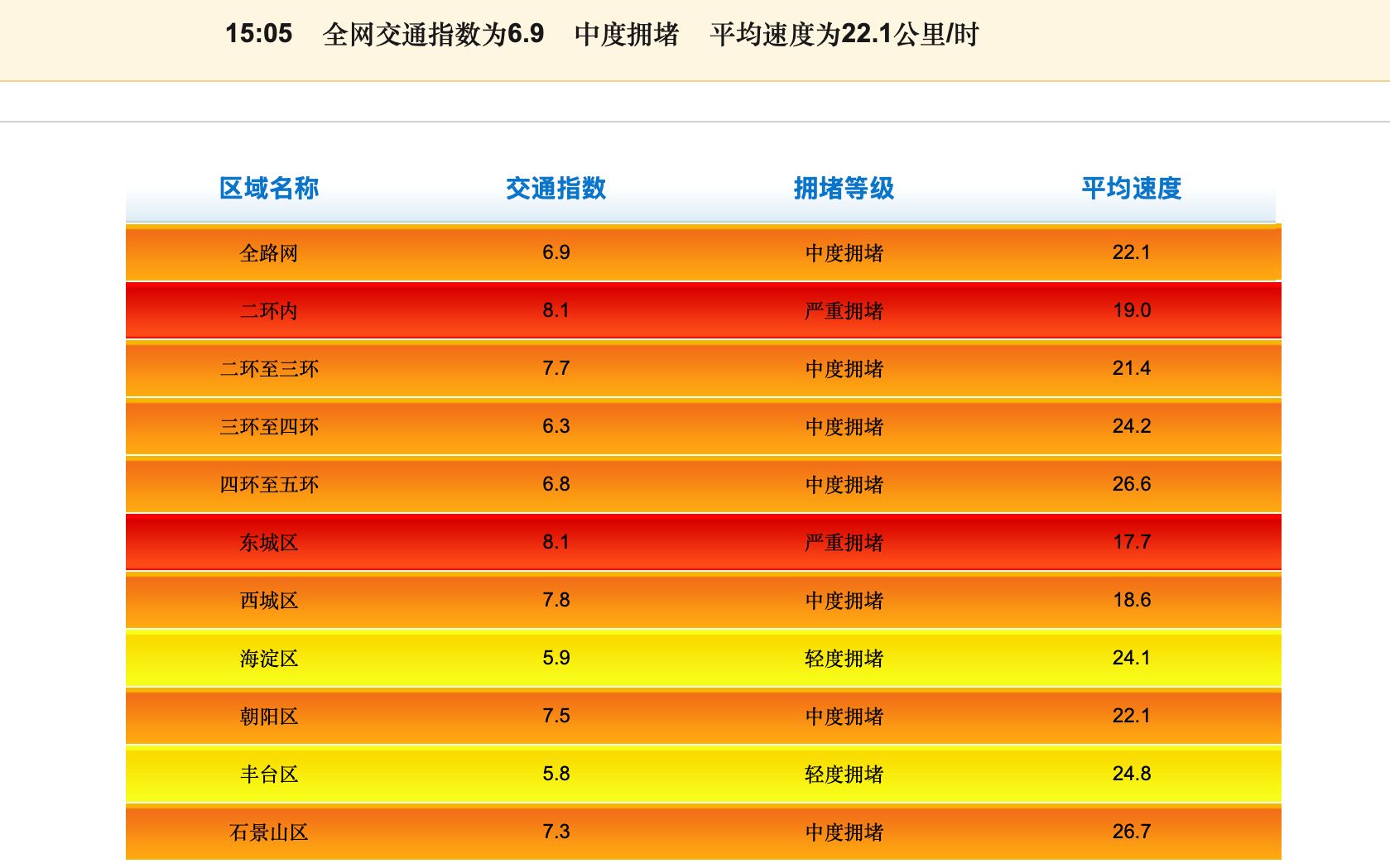 从今天下午的交通情况来看,北京路面交通已有明显的晚高峰提前来临趋势,13时50分,北京交通指数达到6.1,为中度拥堵等级;到14时20分,北京交通指数达到6.4;14时35分,交通指数进一步增长至6.6,其增长速度比常规的周五工作日要快很多。截至今天15时05分,北京交通指数增长至6.9,其中,二环内拥堵最为严重,交通指数已达8.1,属于严重拥堵等级。