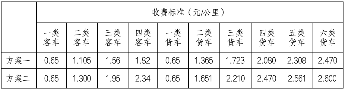 方案一:以0.65元/公里为标准车收费标准,对其他车型收费系数(即和标准车收费标准的比值)在北京市现行收费系数基础上适当下浮。该方案加权后各车型单程收费金额较现行收费标准平均增加5.96元,其中,三、四类客车单程分别增加2.09元、0.70元,五、六类货车分别增加11.75元、16.36元。