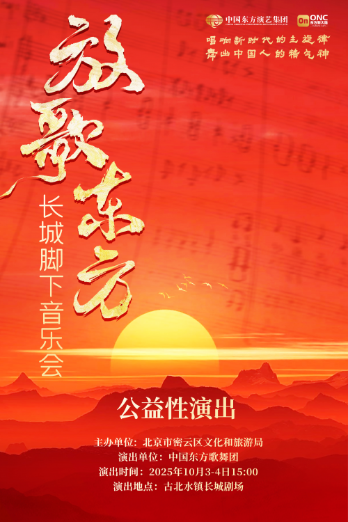 10月3日至4日15:00,中国东方歌舞团倾情呈现《放歌东方》—古北之声音乐会。演出汇聚《相亲相爱》《在希望的田野上》《万泉河水》《美丽中国》《精忠报国》《我爱你中国》等一批反映时代精神、抒发家国情怀的经典作品。牛妞、解新宇、易铭、王陈娜、于浩、袁岱、胡晓琳、婧妍等众多优秀歌唱家将联袂登台,辅以笛子独奏《牧民新歌》、二胡与大提琴重奏《赛马》等器乐节目,在长城怀抱中唱响对祖国的深情礼赞。