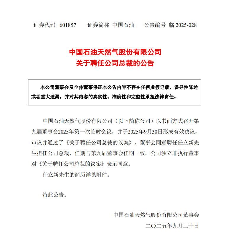 新京报讯 中国石油天然气股份有限公司关于聘任公司总裁的公告发布。