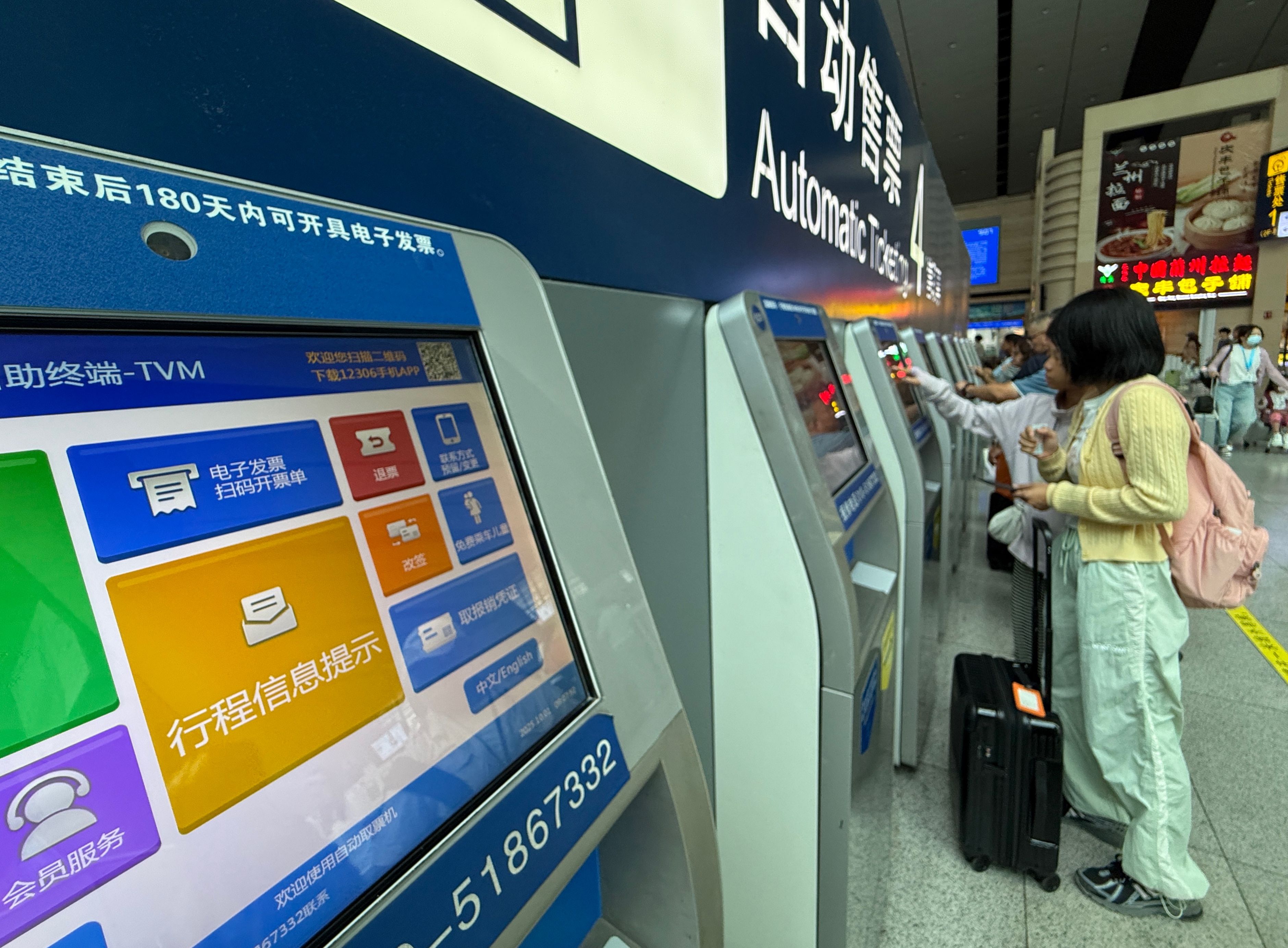 北京南站,乘客在自助售票机前操作。新京报记者 王贵彬 摄