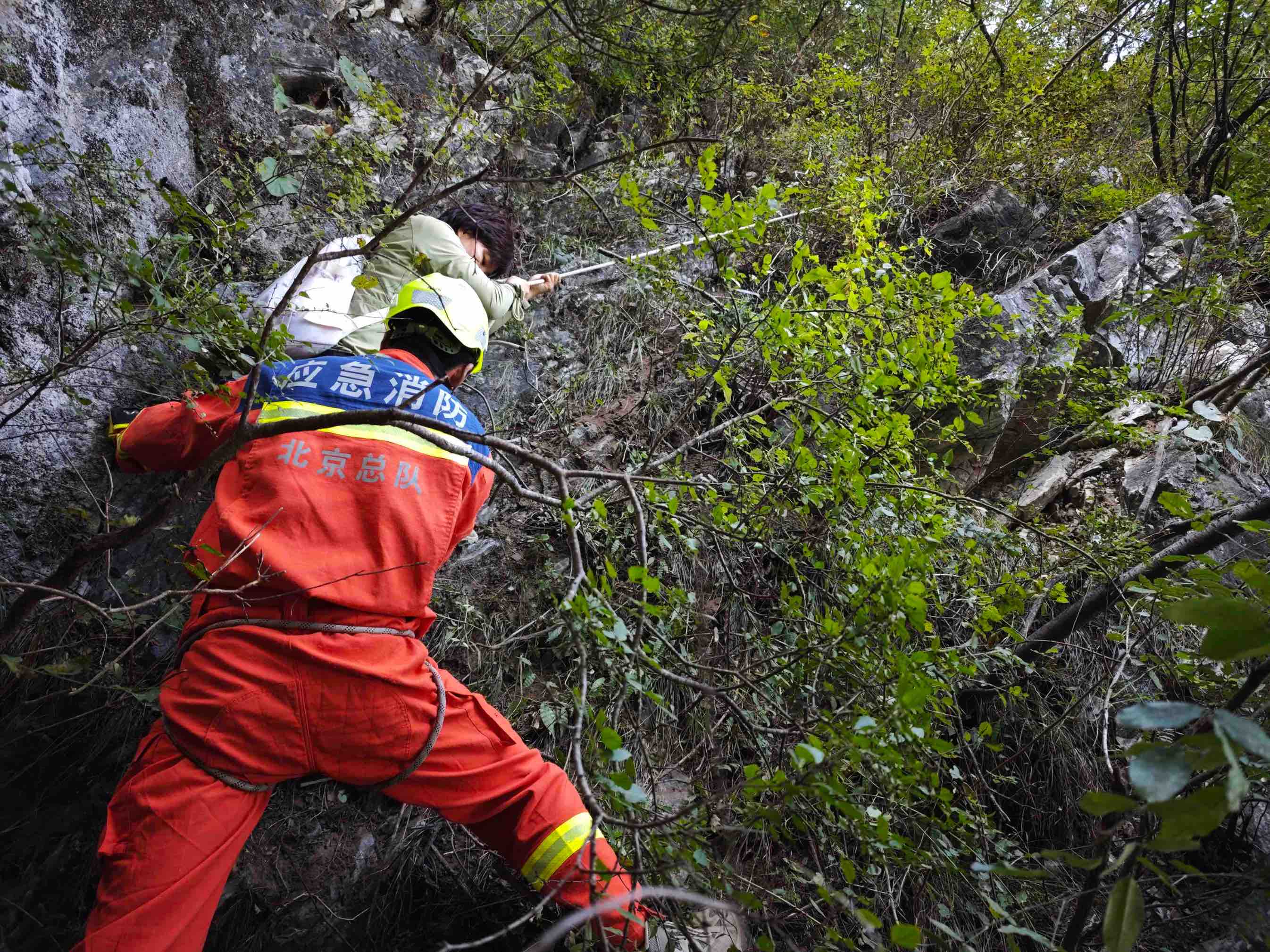 救援人员利用绳索护送被困人员缓慢下山。怀柔消防供图