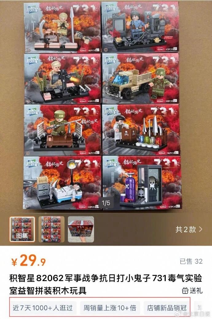 日前,某购物平台上一款名为“731毒气实验室益智拼装积木”的玩具引发争议。据报道,该款玩具共有8小盒,包装盒上均被标注了“铭记历史”字样,还显示具有“爱国教育情感启蒙”“军事主题历史还原”等特色。