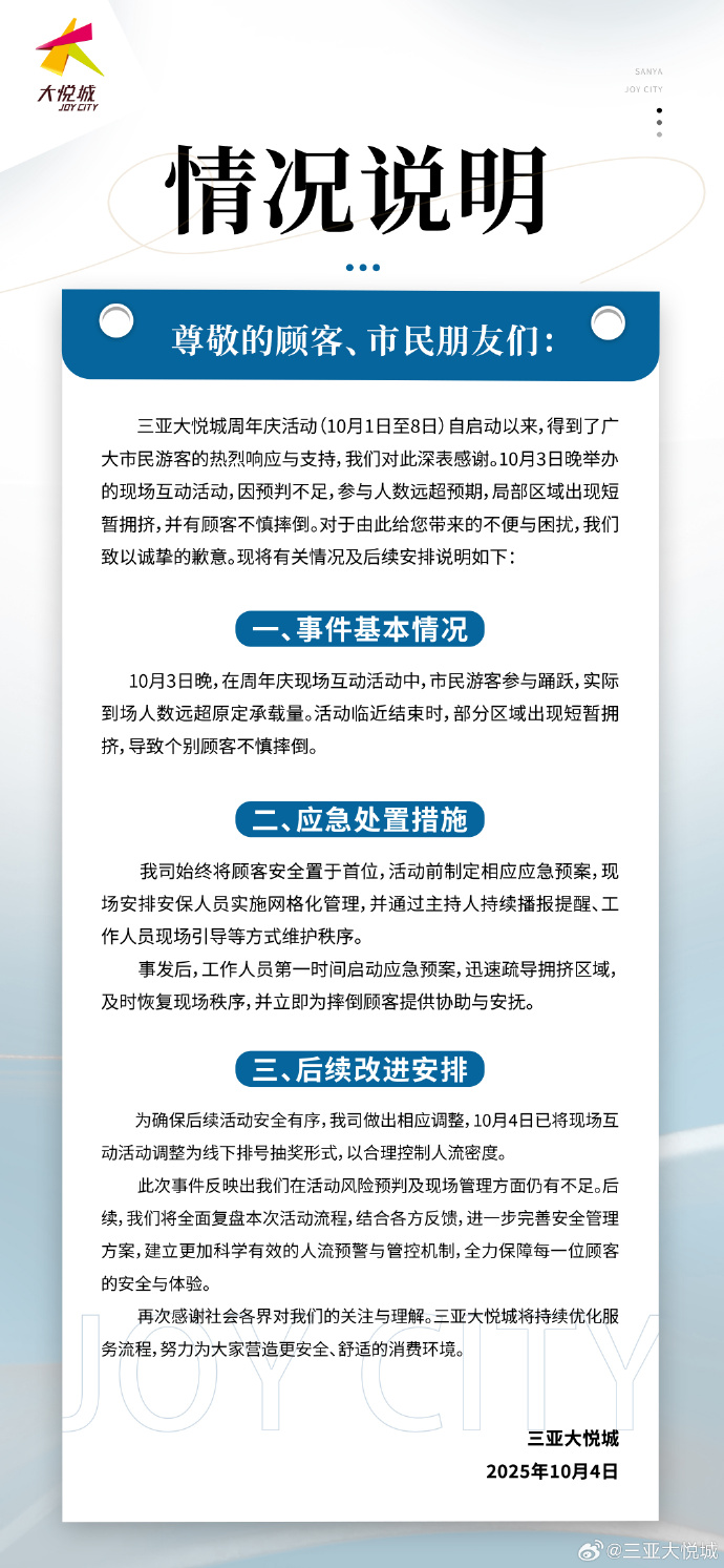 新京报讯 10月4日晚,@三亚大悦城 发布情况说明,内容如下: