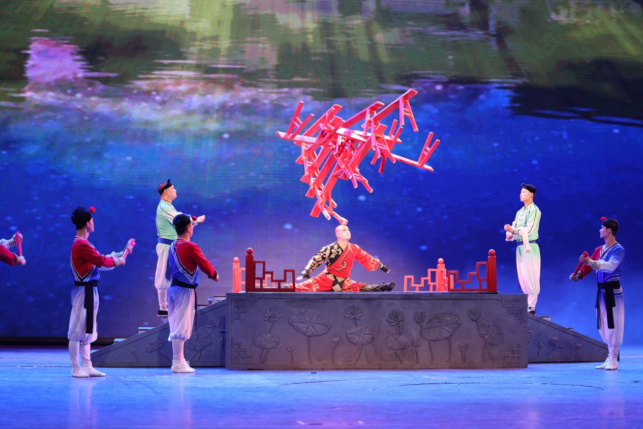 9月28日至29日,“为人民绽放——国家艺术基金优秀杂技节目展演”在河北吴桥江湖大剧院举办,图为四川省遂宁市杂技团表演《焕舞华蓉——顶碗》。新京报记者 寇家祥摄