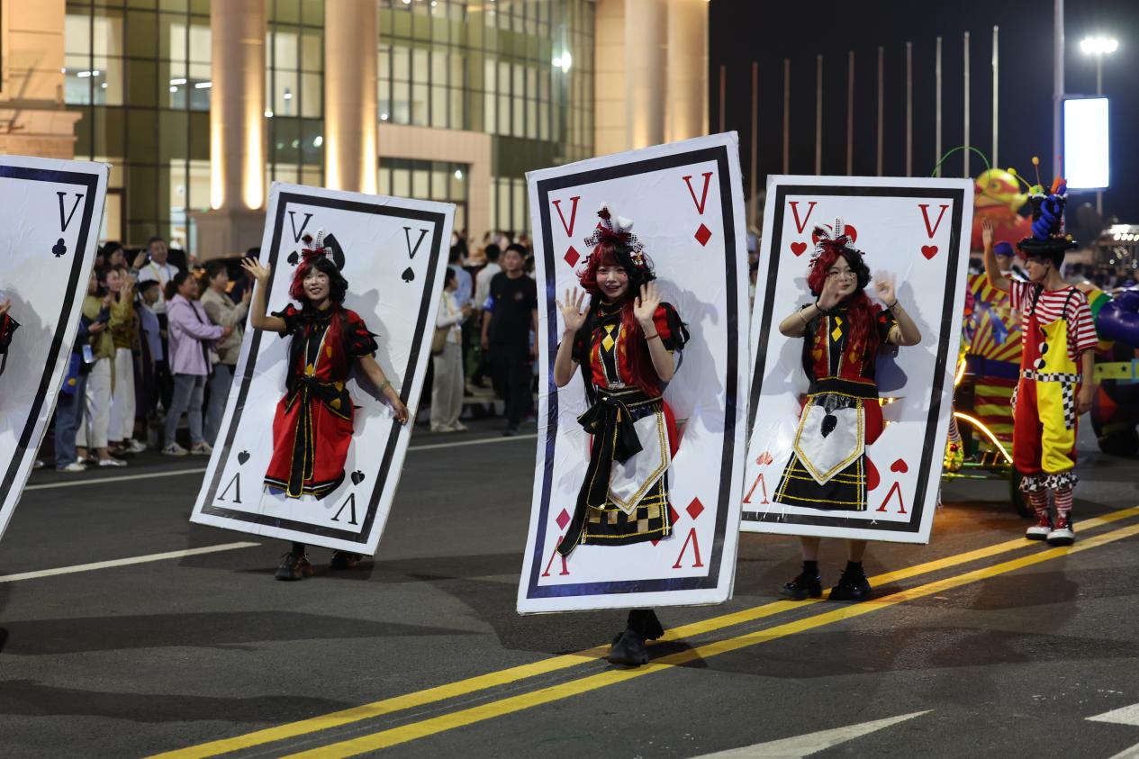 9月28日,第二十届中国吴桥国际杂技艺术节期间,杂技巡游活动在河北沧州吴桥杂技博物馆广场前举行,吸引众多游客围观。新京报记者 寇家祥摄
