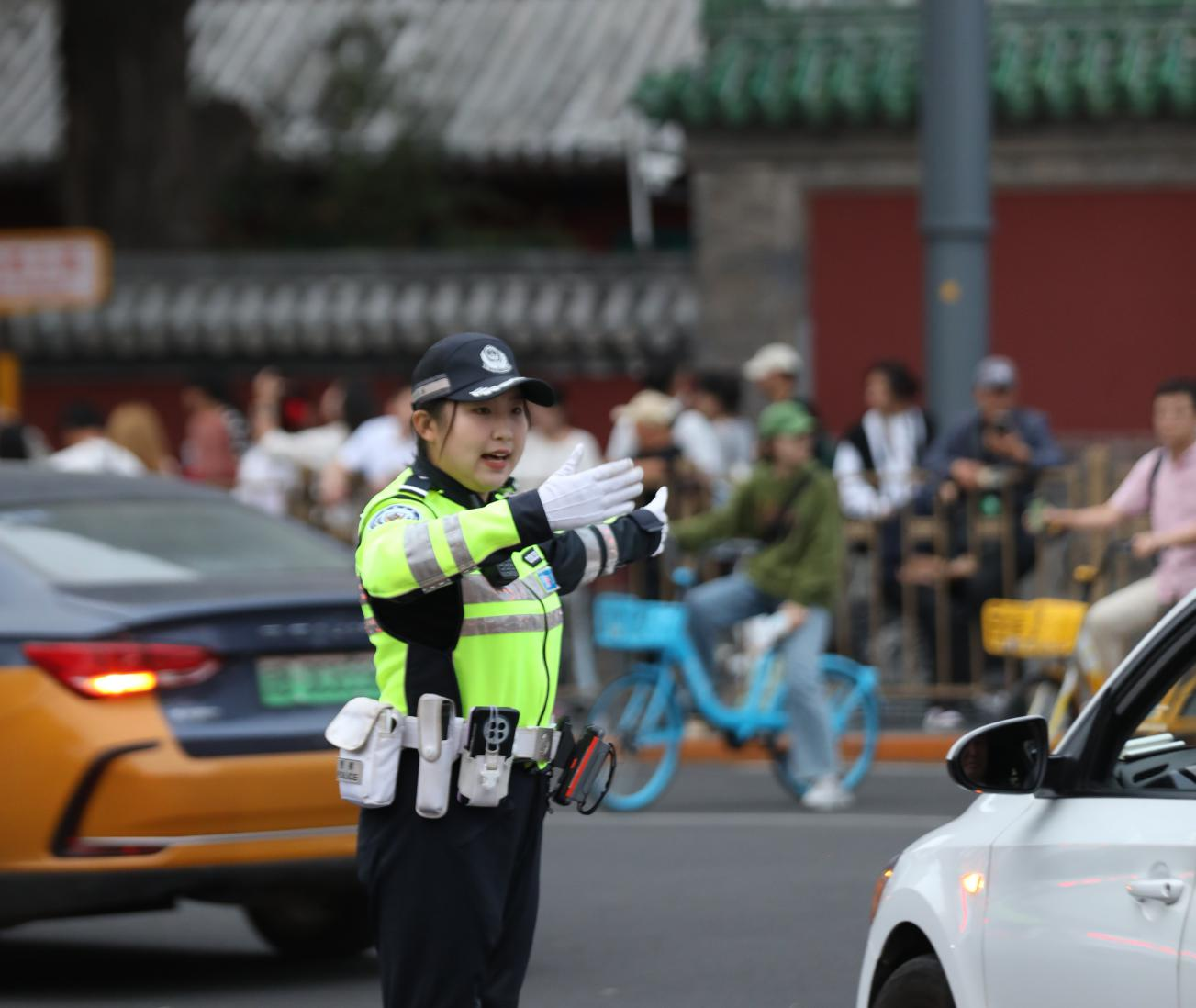 为应对“十一”的大客流,保障出行安全与畅通,交管部门多措并举:加大巡逻频次,确保突发交通事故的快处快清;对易汇集的人流车流进行定点疏导;在地安门外大街斑马线增设临时信号灯;于陟山门周边加设护栏与警戒线,有效规范行车秩序,引导车流有序前行。