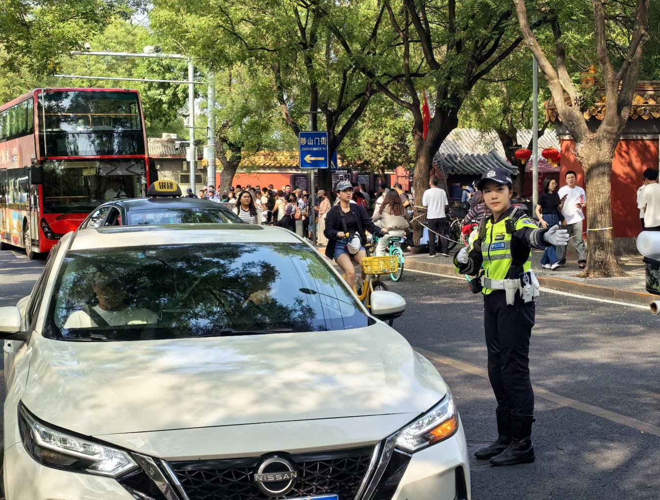 不远处的景山西街,同样面临着严峻考验。作为游客从故宫北门疏散的主要通道,私家车、网约车、公交车在此交织。为此,交管部门针对性增派警力,并在景山西门增设临时信号灯,有效实现了人车分离。