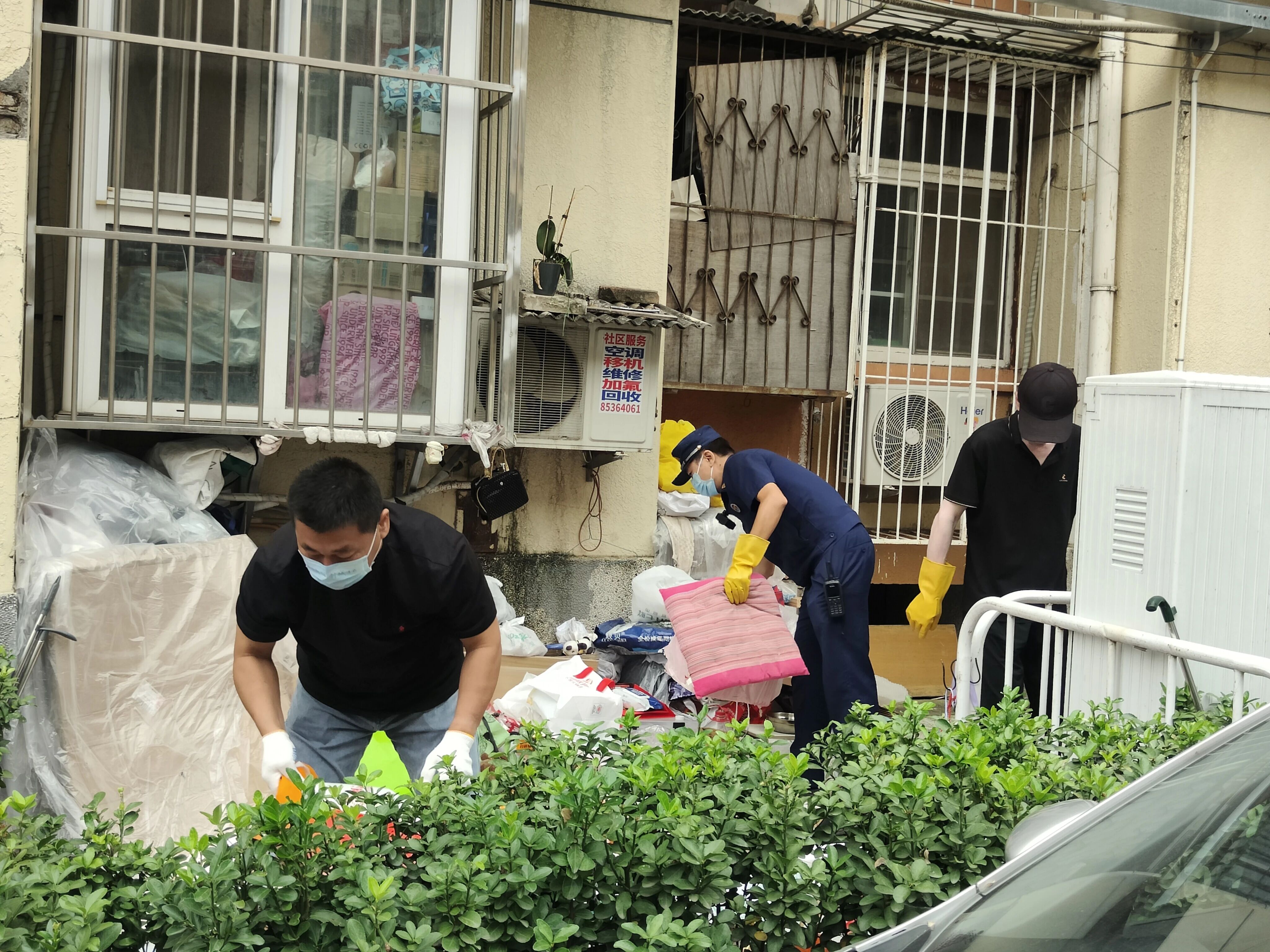 消防员和社区工作人员帮助老人清运杂物。朝阳消防供图