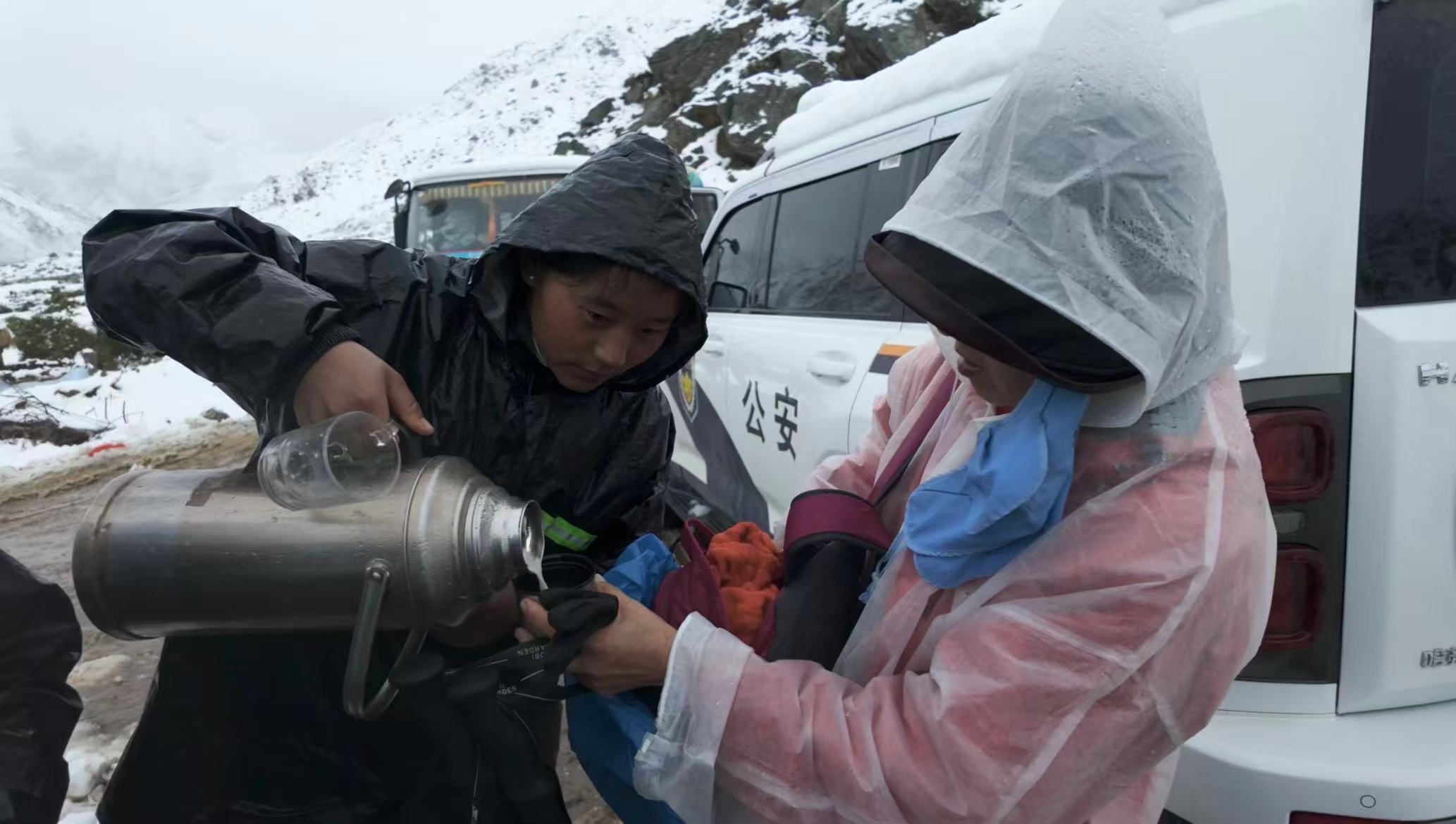 10月5日下午,救援队员给下撤游客倒奶茶。图/陈格爽 摄