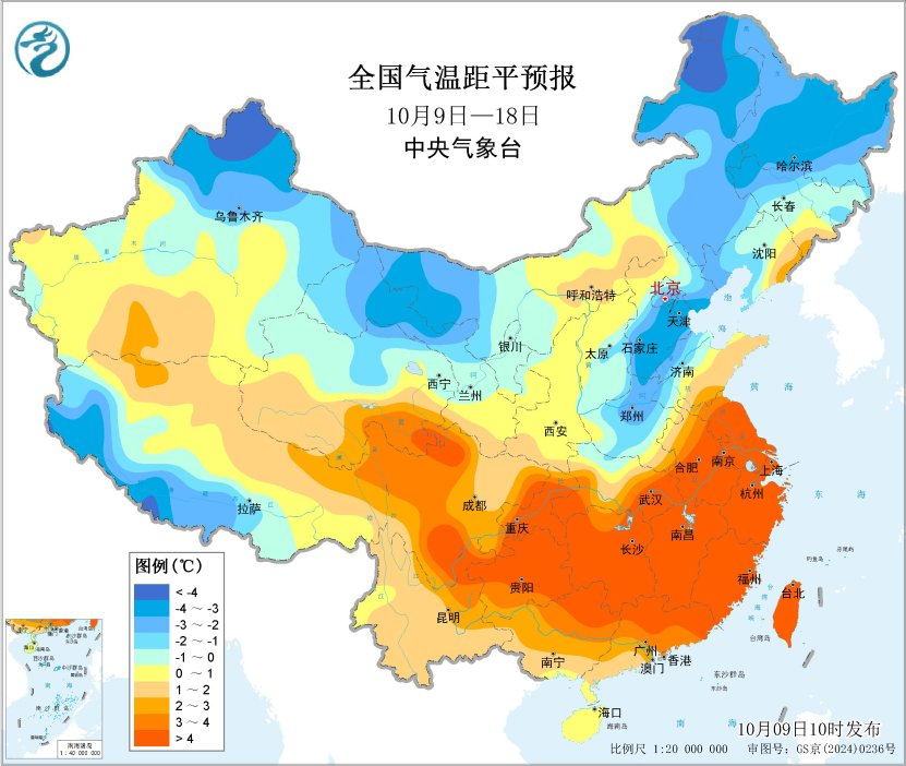 未来10天(10月9日至18日),西北地区东部、华北、黄淮、四川盆地、江汉、华南南部等地累计降水量有40~80毫米,部分地区100~150毫米,局地200毫米以上;上述大部地区降雨量较常年同期偏多七至九成,部分地区偏多1~3倍,我国其余大部降水偏少。