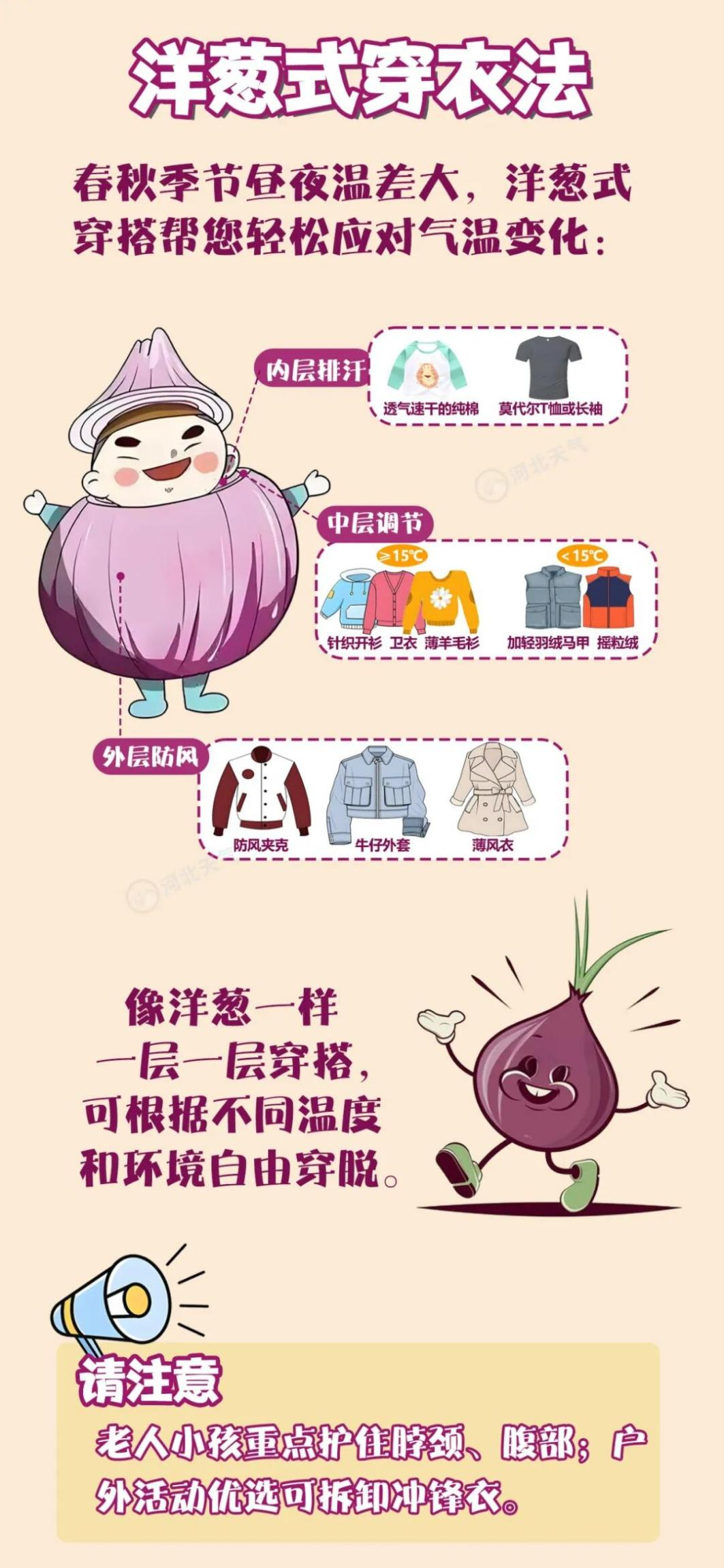 面对突如其来的降温,如何科学增添衣服呢?不妨试试“洋葱式”穿衣法,将防风外层、保暖中层、纯棉里层的衣物“叠穿”,每层都选取方便穿脱的衣物,随时根据温度和环境进行增减。