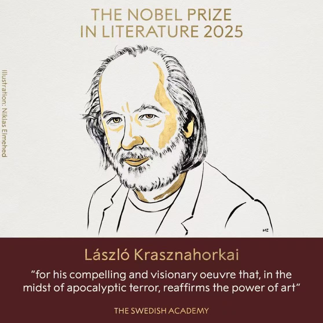当地时间10月9日,瑞典文学院在斯德哥尔摩宣布,将2025年诺贝尔文学奖授予匈牙利作家克劳斯瑙霍尔考伊·拉斯洛(Krasznahorkai László),以表彰其在文学上的成就。