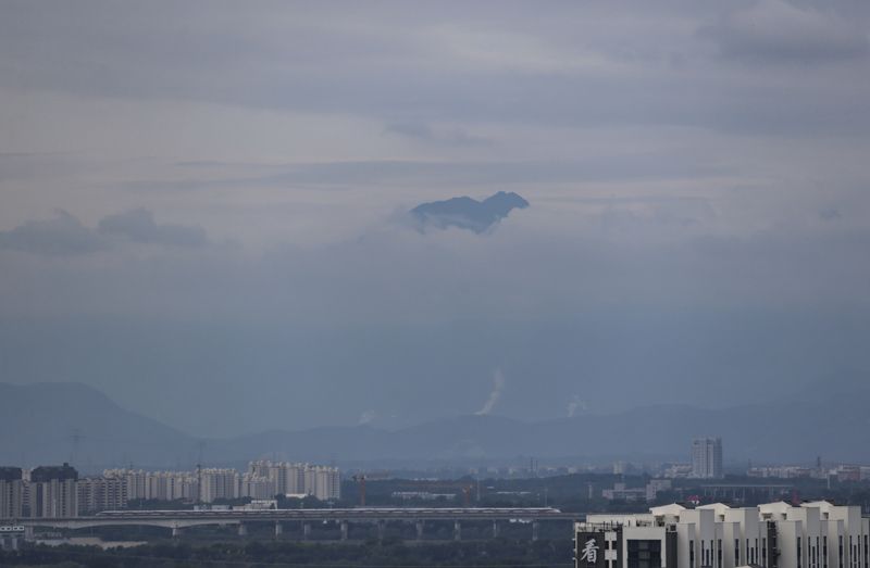 西山从弥漫的云团中露出山尖,一列高铁平稳驶过。