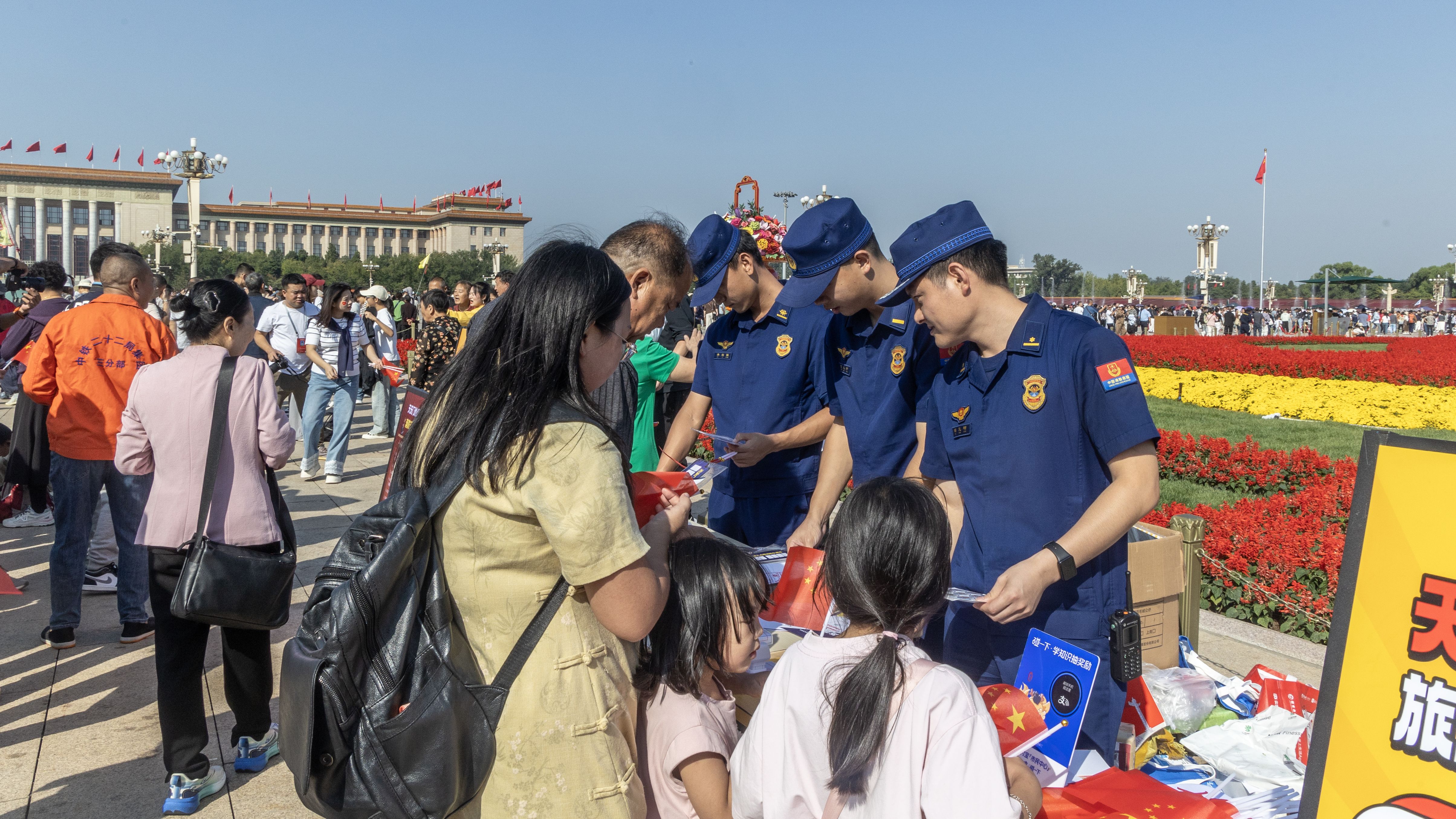 消防员在天安门广场等大客流区域开展沉浸式消防宣传活动。天安门消防供图
