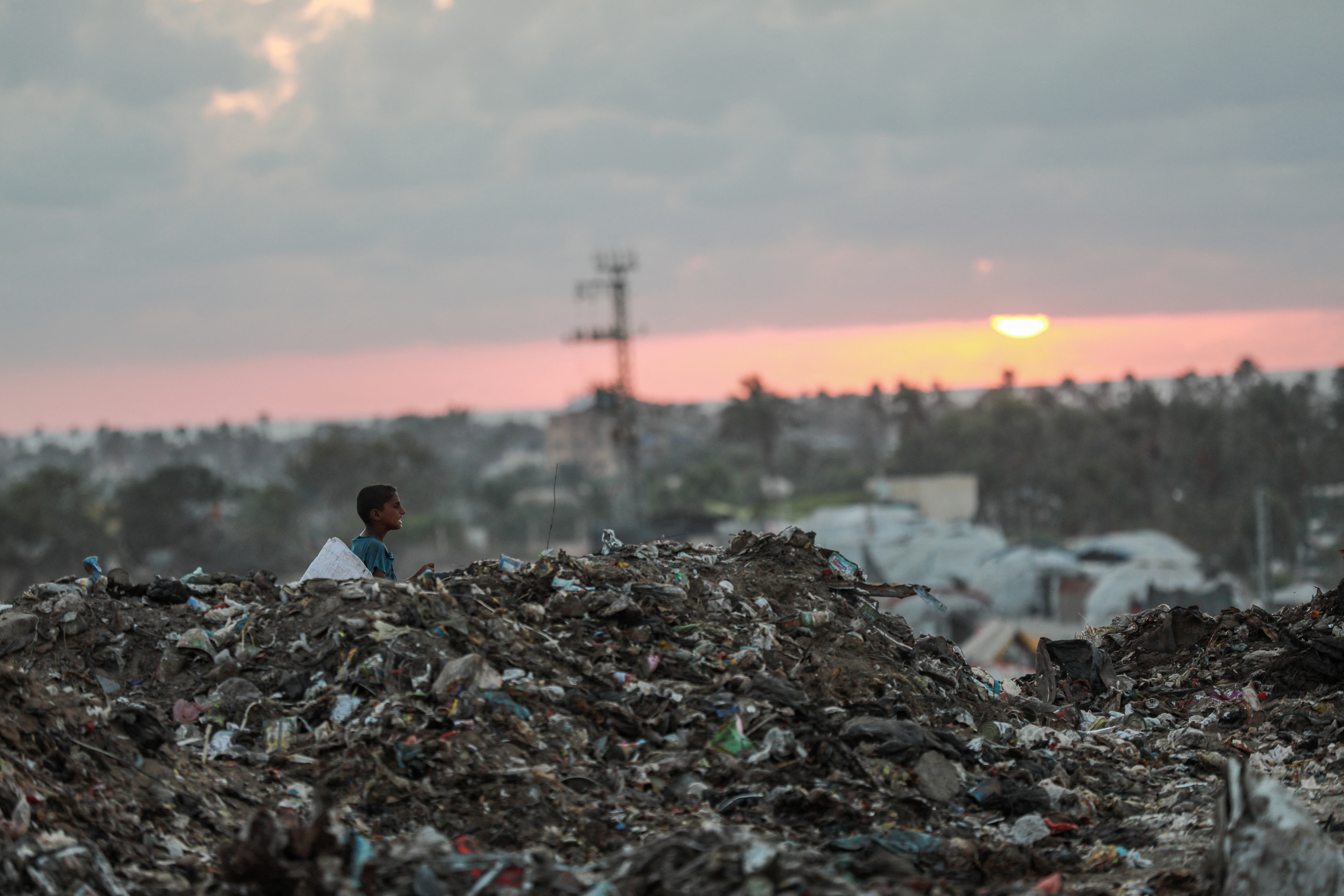 当地时间2025年9月21日,加沙地带代尔拜拉赫,当地儿童从垃圾堆中收集塑料和木材以补贴家用。图/IC photo