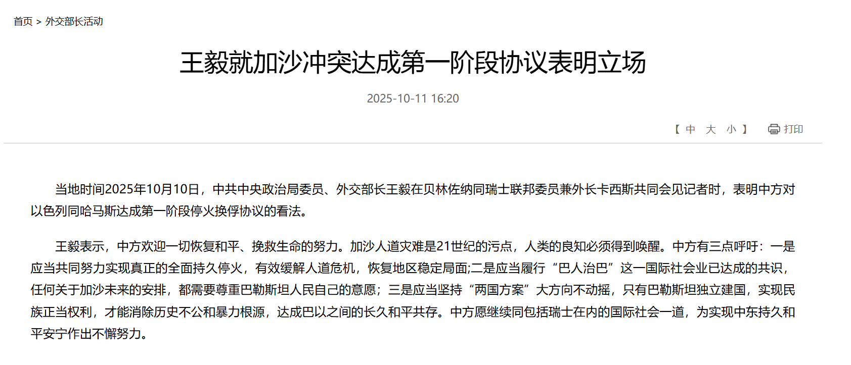 新京报讯 据外交部网站消息,当地时间2025年10月10日,中共中央政治局委员、外交部长王毅在贝林佐纳同瑞士联邦委员兼外长卡西斯共同会见记者时,表明中方对以色列同哈马斯达成第一阶段停火换俘协议的看法。