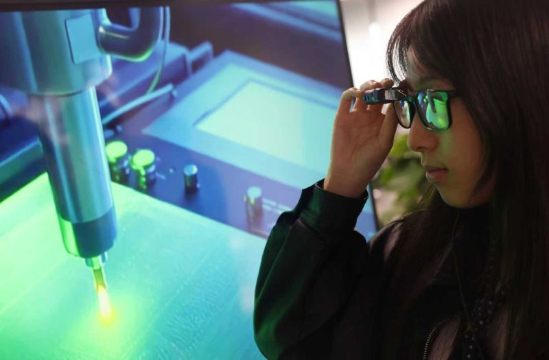 HICOOL产业园内的北京阿法龙科技有限公司,工作人员展示信息采集AR眼镜。