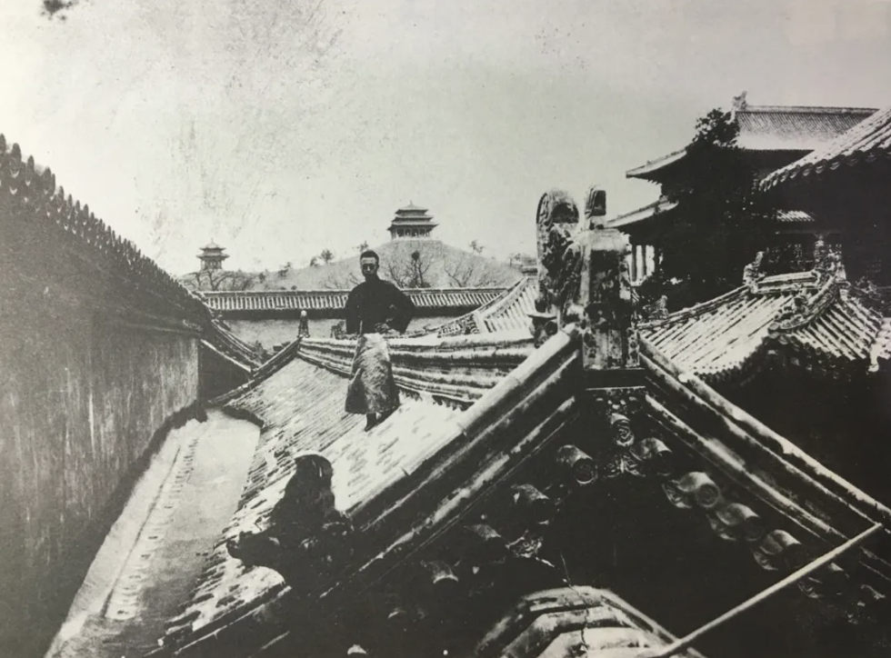 站在紫禁城屋顶上的末代皇帝溥仪。